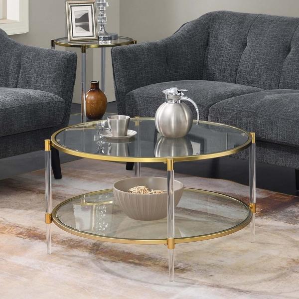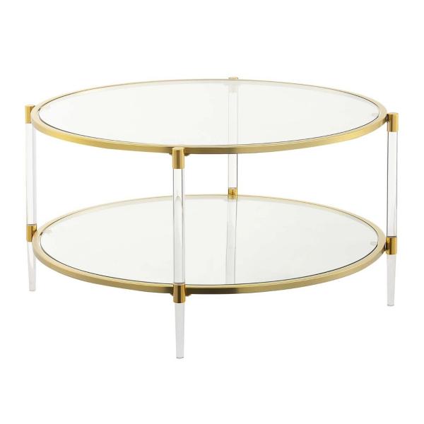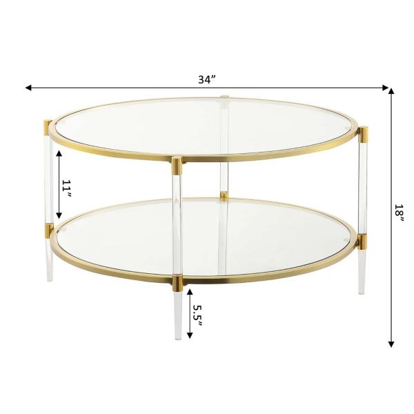 With golden accents complementing its transparent frame, this Round Clear Acrylic and Glass Coffee Table will introduce a contemporary style to your home. You'll love how its updated charm completes your living room! Table measures 18H x 34 in. in diameter Crafted of tempered glass, acrylic, and metal Clear finish Gold edge accents Features one (1) lower shelf Round shape Weight: 40 lbs. Shelf weight capacity: 20 lbs. Assembly required Not intended for commercial use Care: Dust with a soft, dry cloth. This item is available at Kirklands.com only, not available in stores. Please note: this item cannot be shipped to APO/FPO addresses.