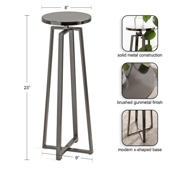 This elegant and refined Round Zia Pewter Metal Accent Table brings sophistication to any space in your home. Inspired by modern design, this cocktail table features an iron construction that provides a delicate, reflective sheen. Table measures 23H x 9 in. in diameter Crafted of metal Pewter finish Round tabletop X-shaped frame Weight capacity: 7 lbs. Assembly required Not intended for commercial use Care: Dust with a soft, dry cloth. WARNING: Cancer and Reproductive Harm - For more information go to www.P65Warnings.ca.gov. This item is available at Kirklands.com only, not available in stores. Please note: this item cannot be shipped to APO/FPO addresses.