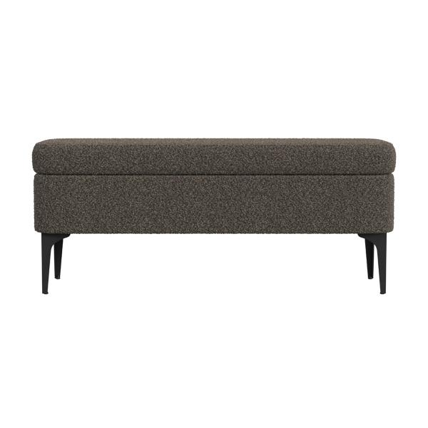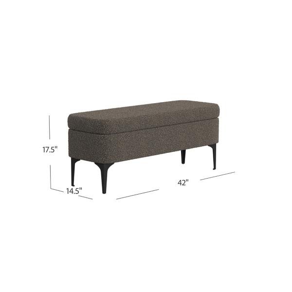 Bring modern storage to your home with this Rounded Dark Brown Boucle Storage Bench! Its sleek design and hidden storage space is perfect for keeping your bedroom, living room, or entryway free of clutter and full of style. Bench measures 42W x 14.5D x 17.5H in. Crafted with a metal frame Upholstered in brown boucle fabric Black metal legs Features interior storage space Rounded edges Weight: 31 lbs. Weight capacity: 250 lbs. Assembly required; see Info & Guides in the drop down below to view or print assembly info Not intended for commercial use Care: Spot clean. This item is available at Kirklands.com only, not available in stores. Please note: this item cannot be shipped to APO/FPO addresses.