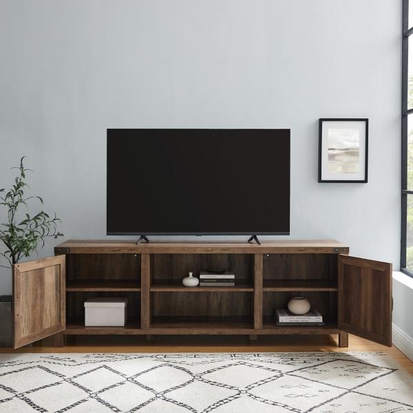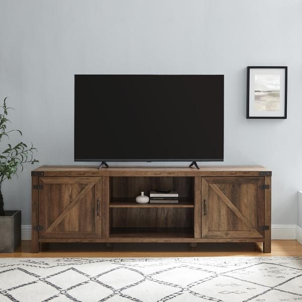 This Rustic Oak Barn Door TV Stand balances style and function effortlessly, providing needed organization. You'll have plenty of space for movies, games, and cable boxes. Its light wood finish is sure to enrich your space! Stand measures 70L x 16W x 24H in. Crafted of warp-resistant wood composite, durable laminate, and metal Rustic oak wood finish Features one (1) fixed shelf and two (2) doors for storage Barn door front design Antique black metal hinge and handle hardware Fits TV sizes up to 85 in. Full assembly required Not intended for commercial use Care: Dust with a soft, dry cloth. This item is available at Kirklands.com only, not available in stores. Please note: this item cannot be shipped to APO/FPO addresses.