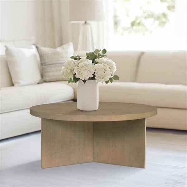 Give your living room a modern focal point with this Sadie Graywash Wood Round Coffee Table by Martha Stewart! This round coffee table flaunts a reclaimed graywash wood finish with a starburst pattern on the veneer top to create a stunning contemporary look. Coffee table measures 16.5H x 36 in. in diameter Crafted of MDF Graywash finish Round shape Solid veneer top with starburst pattern Martha Stewart Collection Weight: 38 lbs. Weight capacity: 85 lbs. Assembly required; see Info & Guides in the drop down below to view or print assembly info Not intended for commercial use Care: Wipe with a soft, damp cloth. This item is available at Kirklands.com only, not available in stores. Please note: this item cannot be shipped to APO/FPO addresses.