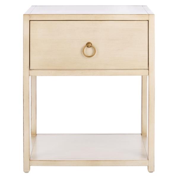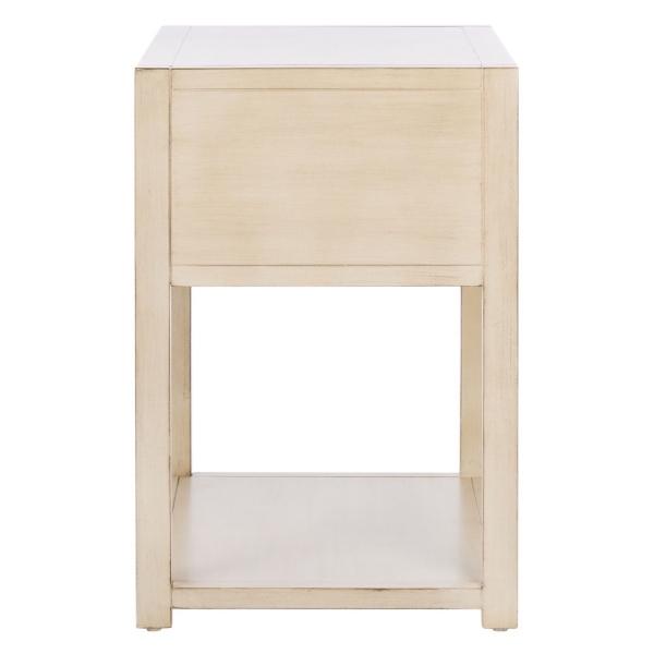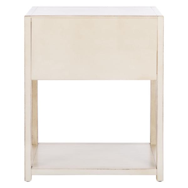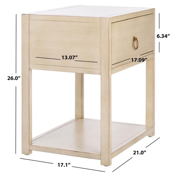 This Safavieh Sadie Antique White Nightstand with Shelf for every space, from classic to contemporary! Plus, its bottom shelf provides ample space for books, magazines, or accessories. Nightstand measures 21W x 17.2D x 26H in. Crafted of rubberwood, plywood, MDF, and metal Antique white finish Features one (1) drawer and a lower shelf Gold metal hardware finish Weight: 25 lbs. Weight capacity: 50 lbs. Assembly required Not intended for commercial use Care: Dust with a soft, dry cloth. WARNING: This product can expose you to chemicals including wood dust, which is known to the state of California to cause cancer and birth defects or other reproductive harm. For more information go to www.P65Warnings.ca.gov.