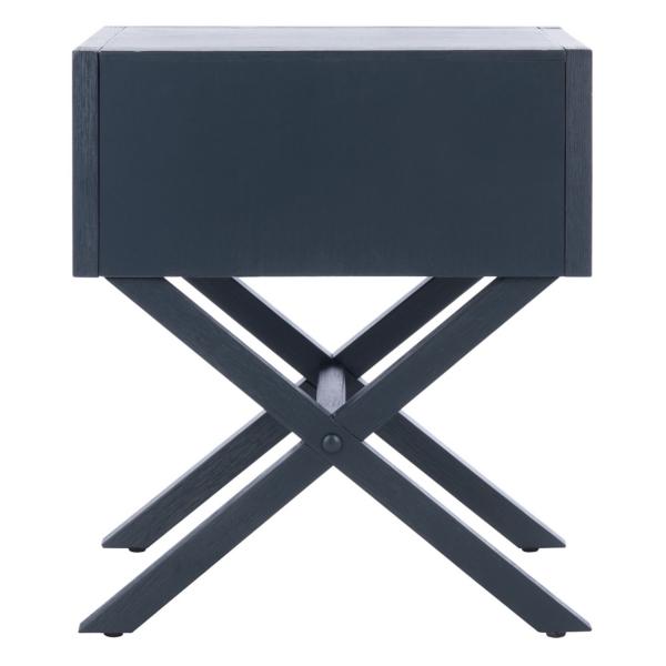 This Safavieh Sadie Navy Blue Nightstand features a classic silhouette with contemporary chic style. The bold navy finish beautifully highlights the gold pull on its drawer, perfect for modern spaces! Nightstand measures 19W x 16D x 22H in. Crafted of rubberwood, MDF, plywood, and metal Navy blue finish Features one (1) drawer X-shape base Gold metal hardware finish Weight: 24 lbs. Weight capacity: 50 lbs. Assembly required Not intended for commercial use Care: Dust with a soft, dry cloth. WARNING: This product can expose you to chemicals including wood dust, which is known to the state of California to cause cancer and birth defects or other reproductive harm. For more information go to www.P65Warnings.ca.gov.