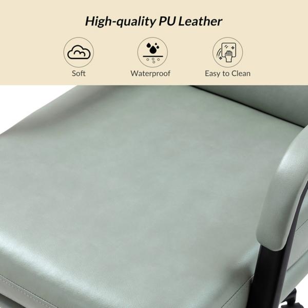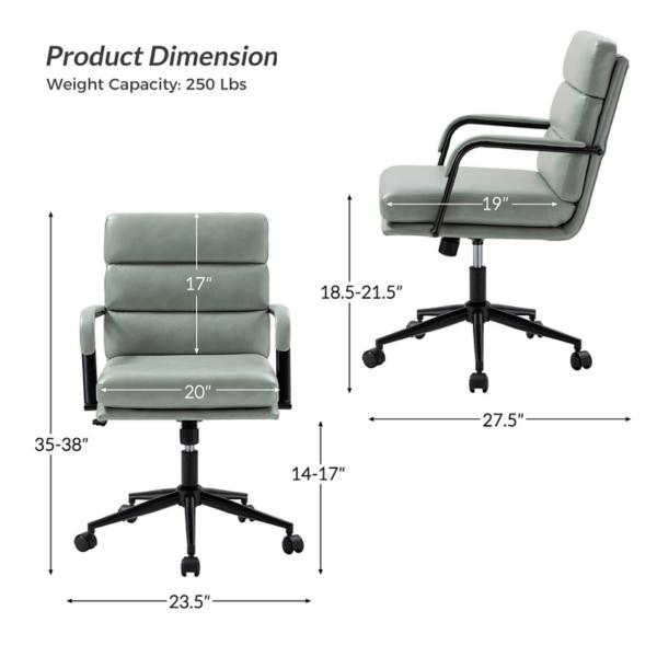 You’ll start looking forward to work days with this Sage Faux Leather Indigo Office Chair! This luxurious chair features plush seating, chic faux leather, swivel capability, and a tilt mechanism to make working comfortable and stylish. Office chair measures 23.5W x 27.5D x 35-38H in. Crafted with a wood frame and metal base Upholstered in sage green faux leather and filled with high-density foam Black metal finish Features adjustable tilt function with tilt lock mechanism 360 degree swivel Adjustable height Seat measures 20W x 19D x 18.5-21.5H in. Weight: 28 lbs. Weight capacity: 250 lbs. Assembly required Not intended for commercial use Care: Wipe with a soft, dry cloth. This item is available at Kirklands.com only, not available in stores. Please note: this item cannot be shipped to APO/FPO addresses.