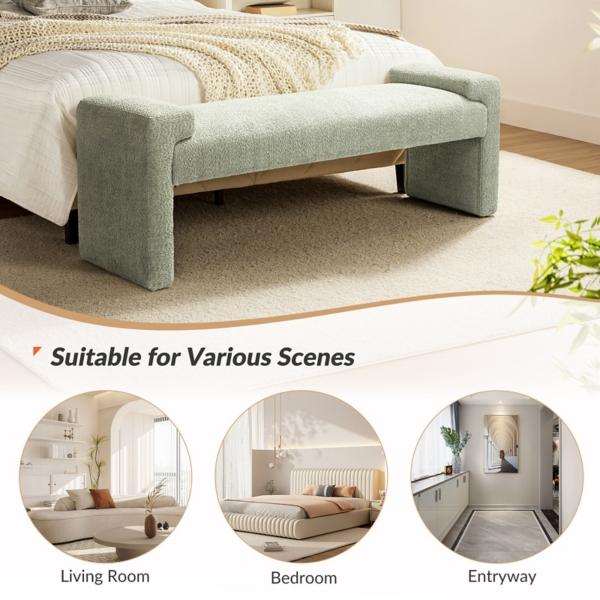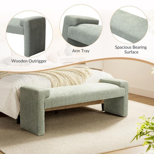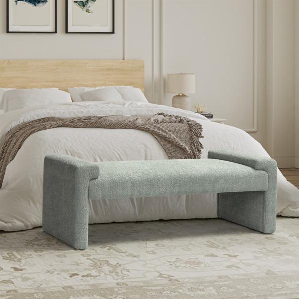 This Sage Severin Upholstered Bench is perfect for incorporating additional seating into any space! It's modern design and soft, textured upholstery is ideal for your living room, bedroom, or entryway. Bench measures 58.5W x 17D x 20H in. Crafted with a wood frame Upholstered in sage green polyester and filled with high-density foam Features an outrigger design with arm trays Seat measures 45W x 17D x 18H in. Weight: 34 lbs. Weight capacity: 250 lbs. Assembly required Not intended for commercial use Care: Spot clean. This item is available at Kirklands.com only, not available in stores. Please note: this item cannot be shipped to APO/FPO addresses.