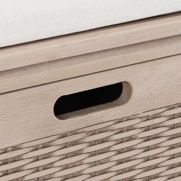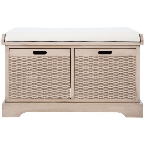 This Sand Upholstered Lanie 2-Drawer Storage Bench performs double duty as a stylish storage solution and perfect seating in an entryway or mudroom. This bench gives your décor a touch of farmhouse charm with its soft sand finish and two spacious basket drawers! Bench measures 32.3W x 15D x 19H in. Crafted of wood and MDF Sand finish Upholstered in white fabric and filled with high-density foam Features two (2) woven basket drawers Drawers measure 13.3W x 9.8D x 11.1H in. Weight: 35 lbs. Weight capacity: 180 lbs. No assembly required Not intended for commercial use Care: Spot clean. This item is available at Kirklands.com only, not available in stores. Please note: this item cannot be shipped to APO/FPO addresses.