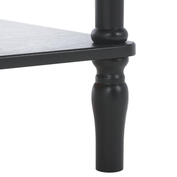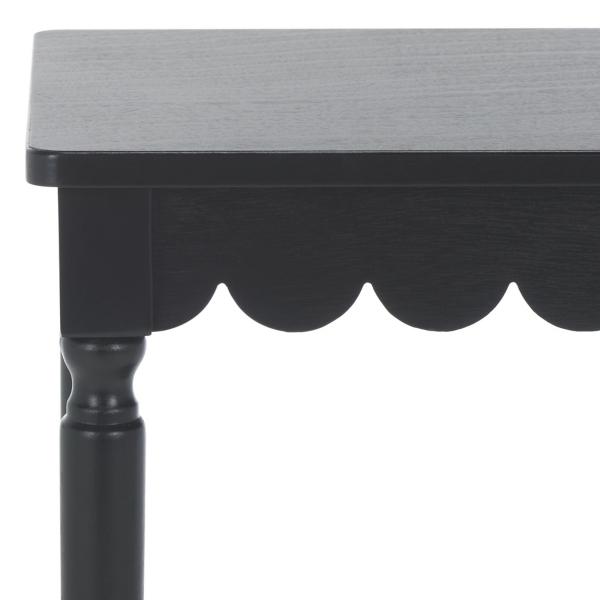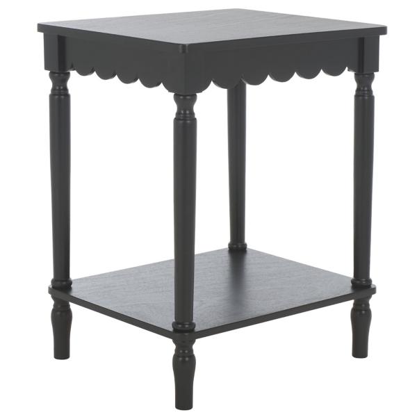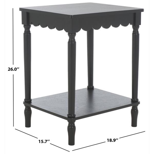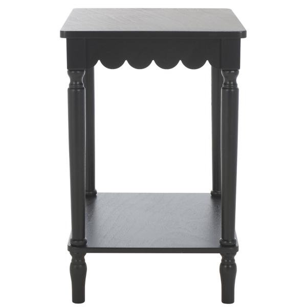 Add a delightfully charming touch to any corner with this Scalloped Black Wood Cottage Accent Table! This side table is perfect for a lamp or for displaying your favorite decorative accessories. Accent table measures 19.5W x 15.7D x 24H in. Crafted of pine wood and MDF Black finish Features one (1) lower shelf Scalloped apron Weight: 11 lbs. Weight capacity: 40 lbs. Some assembly required; see Info & Guides in the drop down below to view or print assembly instructions Not intended for commercial use Care: Wipe with a soft, dry cloth. This item is available at Kirklands.com only, not available in stores. Please note: this item cannot be shipped to APO/FPO addresses.
