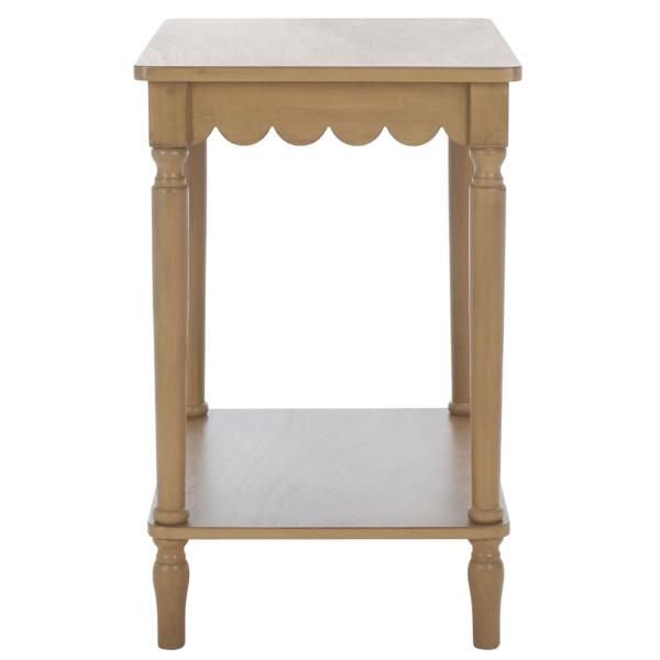 Add a delightfully charming touch to any corner with this Scalloped Brown Wood Cottage Accent Table! This side table is perfect for a lamp or for displaying favorite decorative accessories. Accent table measures 19.5W x 15.7D x 24H in. Crafted of pine wood and MDF Brown finish Features one (1) lower shelf Scalloped apron Weight: 11 lbs. Weight capacity: 40 lbs. Some assembly required; see Info & Guides in the drop down below to view or print assembly instructions Not intended for commercial use Care: Wipe with a soft, dry cloth. This item is available at Kirklands.com only, not available in stores. Please note: this item cannot be shipped to APO/FPO addresses.