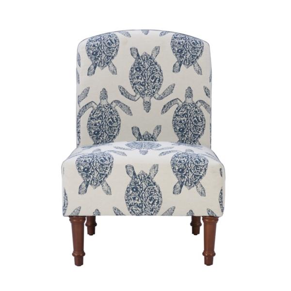 Bring some exciting coastal comfort into your living space with our Sea Turtle Print Accent Chair! This piece will quickly become a favorite in your home. Chair measures 27L x 25W x 35H in. Crafted with a wooden frame High-density foam fill Upholstered in a sea turtle print fabric Brown leg finish Hues of blue, white, and brown Some assembly required Not intended for commercial use Care: Dust with a soft, dry cloth. This item is available at Kirklands.com only, not available in stores. Please note: this item cannot be shipped to APO/FPO addresses.