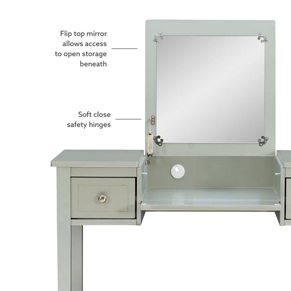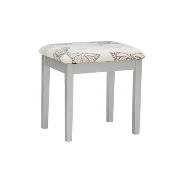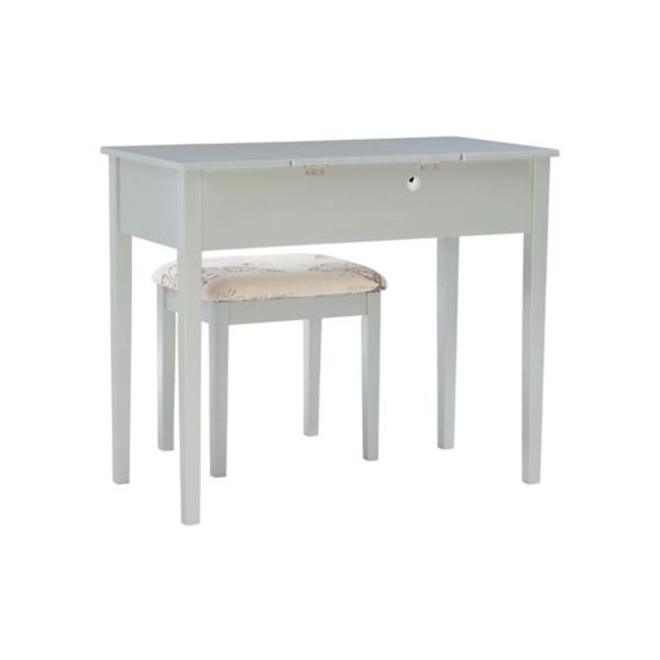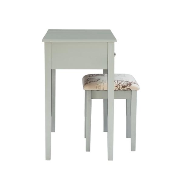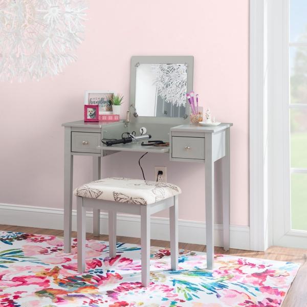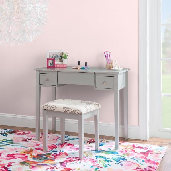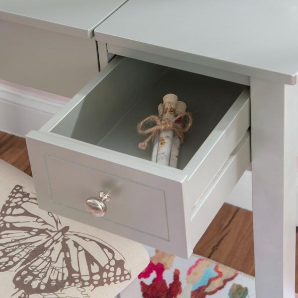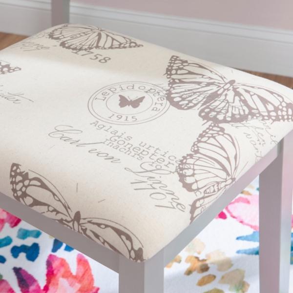 Constructed of solid wood, this Silver Virginia Butterfly Vanity Set includes a matching stool upholstered with a unique butterfly print on linen fabric. With two drawers and a lift top mirror, you’ll find ample storage for beauty supplies! Set includes one (1) vanity and one (1) stool Vanity measures 36W x 18D x 30H in. Stool measures 18W x 14.5D x 18.5H in. Crafted of wood Silver finish Stool upholstered in beige butterfly print fabric with high-density foam Features a flip top mirror and two (2) drawers Equipped with a cord management port Flip down front panel Weight: 45.5 lbs. Weight capacity (stool): 275 lbs. Weight capacity (vanity): 100 lbs. Assembly required Not intended for commercial use Care: Wipe with a soft, dry cloth. This item is available at Kirklands.com only, not available in stores. Please note: this item cannot be shipped to APO/FPO addresses. WARNING: Cancer and Reproductive Harm - For more information go to www.P65Warnings.ca.gov.