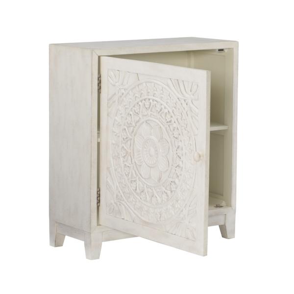 Bring some bohemian flair to your space with our Smokey White Resin Medallion Door Cabinet. You’ll love the smokey white antique finish of this spacious and stylish cabinet. Cabinet measures 25.5L x 11.5W x 29.25H in. Crafted of wood and resin Smokey white finish Features a resin medallion design on door front Door reveals one (1) fixed shelf Door features a magnetic touch latch to open and close Weight: 45.2 lbs. Shelf weight capacity: 30 lbs. No assembly required Not intended for commercial use Care: Dust with a soft, dry cloth. This item is available at Kirklands.com only, not available in stores. Please note: this item cannot be shipped to APO/FPO addresses. WARNING: Cancer and Reproductive Harm - For more information go to www.P65Warnings.ca.gov.