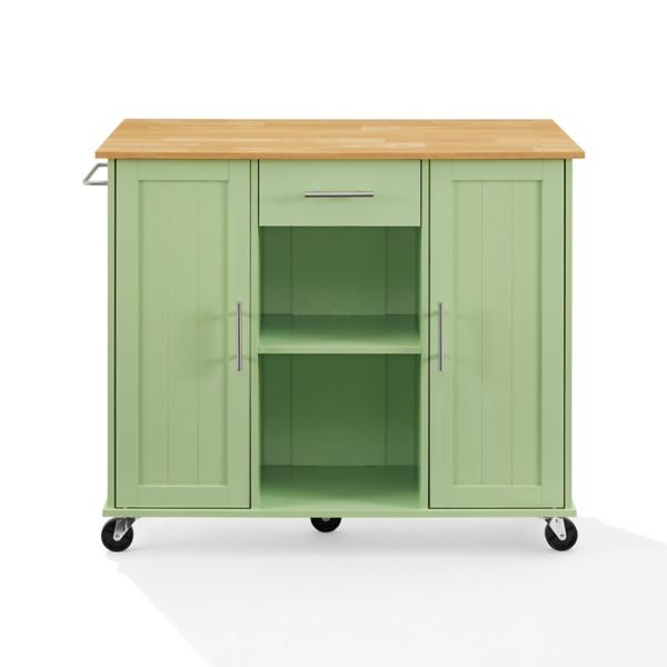 The Stella Mint Drop-Leaf Kitchen Cart enhances your kitchen workspace with style. This mobile island features two spacious cabinets with adjustable shelves and a storage drawer to keep utensils organized. The open center storage area also includes an adjustable shelf for added versatility. With its extendable countertop, the cart transforms into an island table—perfect for pulling up your favorite counter stools and enjoying a casual meal. Overall dimensions Width: 42.1 in. Depth: 25.75 in. Height: 35.6 in. Crafted of wood and metal Drop-leaf design Natural tabletop finish Mint finish Brushed nickel hardware finish Each kitchen cabinet has one adjustable storage shelf Cabinet doors have beadboard accents, magnetic closures, and concealed hinges Open center storage has an adjustable shelf Center kitchen storage drawer has metal roller glides Weight: 77.4 lbs. Shelf weight capacity: 15 lbs. each Storage drawer weight capacity: 15 lbs. Assembly required Not intended for commercial use Care: Dust with a soft, dry cloth. This item is available at Kirklands.com only, not available in stores. Please note: this item cannot be shipped to APO/FPO addresses.