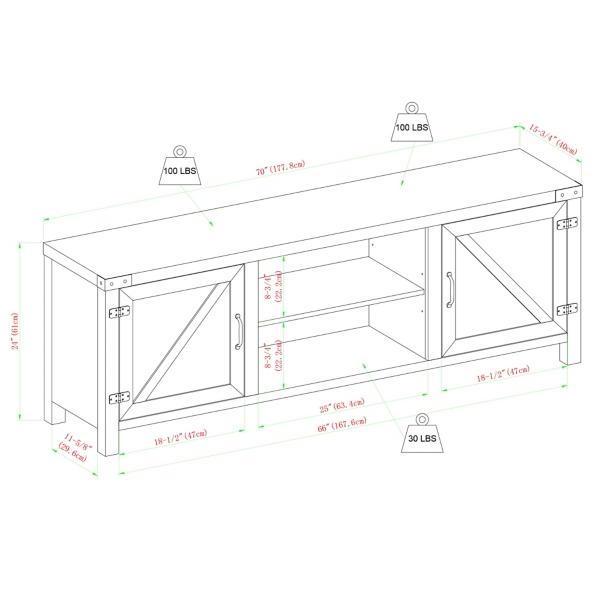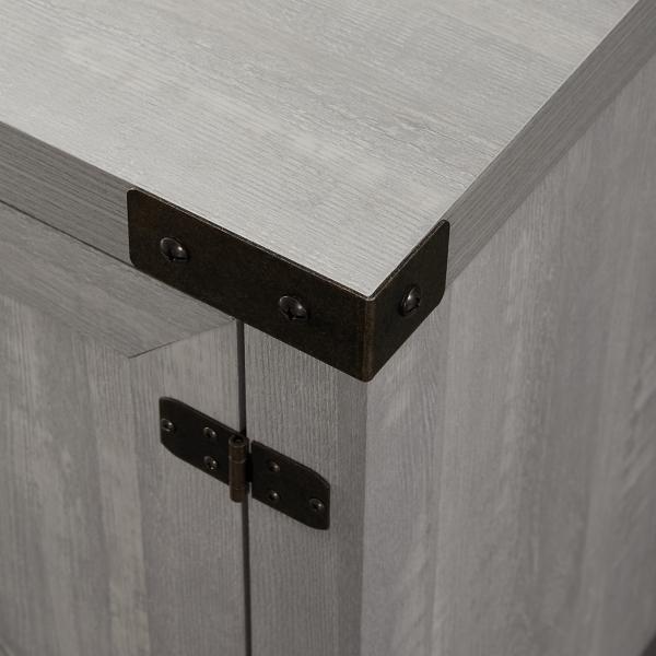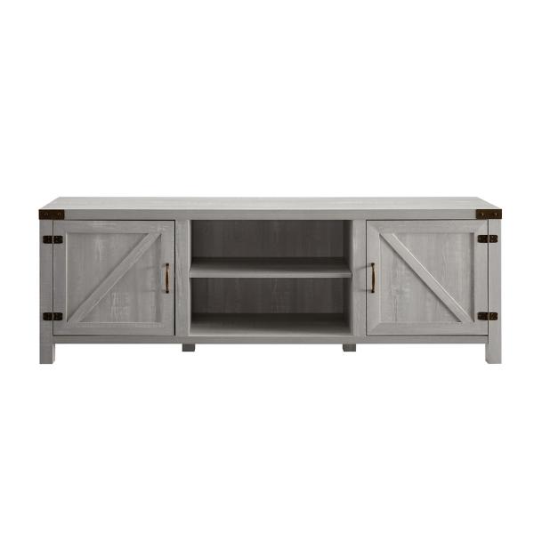 This Stone Gray Barn Door TV Stand balances style and function effortlessly, providing needed organization. You'll have plenty of space for movies, games, and cable boxes. Its light wood finish is sure to enrich your space! Stand measures 70L x 16W x 24H in. Crafted of warp-resistant wood composite, high-quality laminate, and metal Stone gray wood finish Features one (1) fixed shelf and two (2) doors for storage Barn door front design Antique bronze metal hinge and handle hardware Fits TV sizes up to 85 in. Full assembly required Not intended for commercial use Care: Dust with a soft, dry cloth. This item is available at Kirklands.com only, not available in stores. Please note: this item cannot be shipped to APO/FPO addresses.