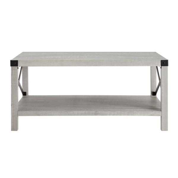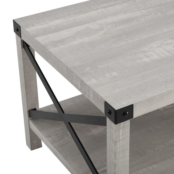 Give your space an elevated rustic look with our Stone Gray Modern Farmhouse Coffee Table. You'll love the look of the metal accents and x-shaped sides. Table measures 40L x 22W x 18H in. Crafted of warp-resistant wood composite, durable laminate, and metal Gray wood finish and black metal finish Features one (1) lower storage shelf Features x-shaped side accents and metal corner accents Weight: 48 lbs. Full assembly required Not intended for commercial use Care: Dust with a soft, dry cloth. This item is available at Kirklands.com only, not available in stores. Please note: this item cannot be shipped to APO/FPO addresses. WARNING: Cancer and Reproductive Harm - For more information go to www.P65Warnings.ca.gov.