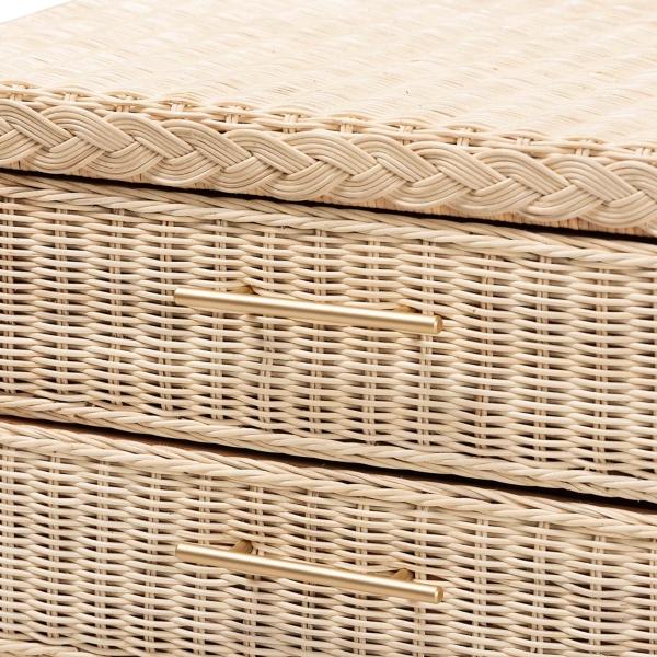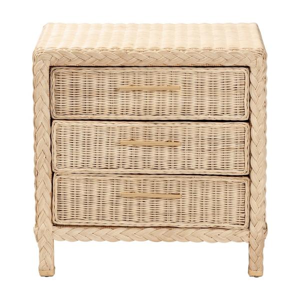 Add a touch of natural charm to your bedroom with this Sun Bleached Braided Rattan Nightstand! This nightstand features three spacious drawers for your bedside essentials. It's perfect for coastal or boho chic spaces! Nightstand measures 23.6W x 18.1D x 24H in. Crafted of wood and rattan Sun-bleached finish Features three (3) drawers Braided rattan embellishments Metal handles Drawers measure 18W x 13D x 4H in. Weight: 37 lbs. No assembly required Not intended for commercial use Care: Wipe with a soft, dry cloth. This item is available at Kirklands.com only, not available in stores. Please note: this item cannot be shipped to APO/FPO addresses.