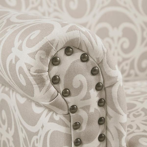 Add an eye-catching touch to your living room with this Tan Fretwork Club Accent Chair! This accent chair features an all-over fretwork pattern that creates a stunning transitional look. The double row nailhead trim adds elegance to the design for a chic accent to your space! Chair measures 29.25W x 31D x 34.75H in.; seat height: 19 in. Crafted with a solid wood and plywood frame Upholstered in polyester with high-density foam fill Birch legs with espresso finish Features an all-over fretwork pattern Accented with double rows of nailhead trim Hues of tan and white Round arms Loose cushion, not reversible Seat dimensions: 18.5W x 20.5D x 6H in. Weight: 39.67 lbs. Weight capacity: 300 lbs. Some assembly required Not intended for commercial use Care: Spot clean. This item is available at Kirklands.com only, not available in stores. Please note: this item cannot be shipped to APO/FPO addresses.