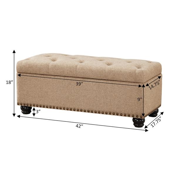 Enjoy the comfort and versatility of this Tan Upholstered Carey Storage Ottoman Bench! This ottoman features plenty of storage space while also offering plush and stylish seating for your space. You'll love how it elevates your living room or bedroom! Ottoman measures 42L x 17.75W x 18H in. Crafted with a wood frame Upholstered in tan fabric with high-density foam Black wood finish Features interior storage space Button-tufted lid Accented with nailhead trim Pressure hinge to allow lid to stay open on its own Assembly: Attach feet. Not intended for commercial use Care: Spot clean. This item is available at Kirklands.com only, not available in stores. Please note: this item cannot be shipped to APO/FPO addresses.