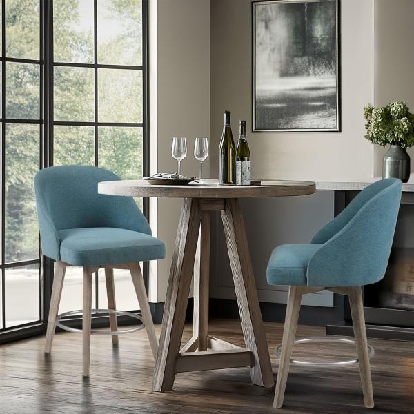 The Teal Blue Upholstered Pearce Swivel Counter Stool combines style and comfort that’s ideal for small spaces. You’ll love it in your apartment’s dining area! Overall dimensions Width: 23 in. Depth: 20 in. Height: 38.5 in. Crafted of wood and MDF Natural finish Upholstered in a teal blue polyester and linen blend with high-density foam Features a 360 degree swivel capability Includes a silver metal footrest Weight capacity: 300 lbs. Assembly required Not intended for commercial use Care: Spot clean only. This item is available at Kirklands.com only, not available in stores. Please note: this item cannot be shipped to APO/FPO addresses.