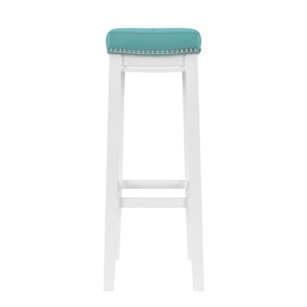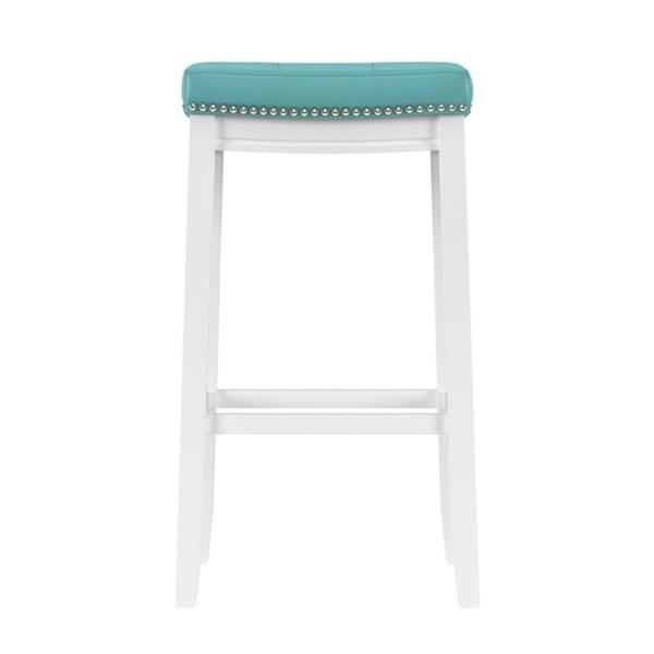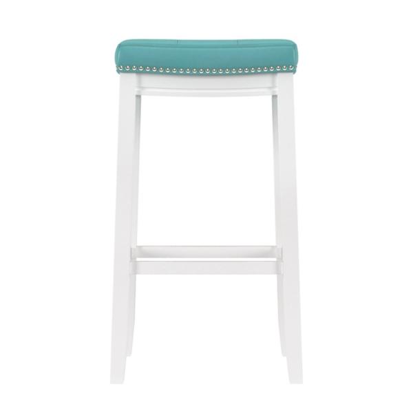 Add a pop of color to your kitchen with this Teal Faux Leather Claridge Bar Stool! You'll love the contrast of the white frame and teal seat. This stool is perfect for making a bold statement in your home! Counter stool measures 18.75W x 13.25D x 32.25H in. Crafted of rubberwood and MDF Upholstered in teal faux leather with high-density foam fill White wood finish Features a backless design Accented with nailhead trim Weight: 12.8 lbs. Weight capacity: 225 lbs. Assembly required Not intended for commercial use Care: Wipe with a soft, dry cloth. This item is available at Kirklands.com only, not available in stores. Please note: this item cannot be shipped to APO/FPO addresses.