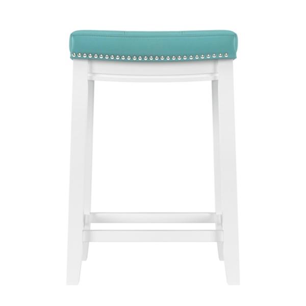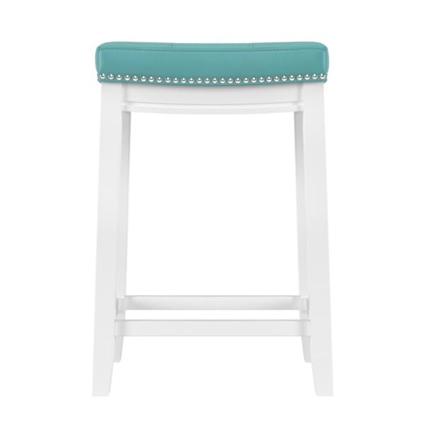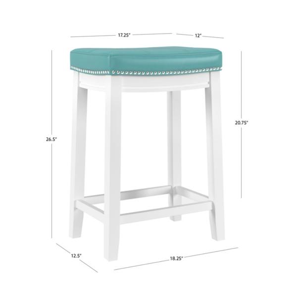 Add a pop of color to your kitchen with this Teal Faux Leather Claridge Counter Stool! You'll love the contrast of the white frame and teal seat. This stool is perfect for making a bold statement in your home! Counter stool measures 18.25W x 12.5D x 26.5H in. Crafted of rubberwood and MDF Upholstered in teal faux leather with high-density foam fill White wood finish Features a backless design Accented with nailhead trim Weight: 12.8 lbs. Weight capacity: 225 lbs. Assembly required Not intended for commercial use Care: Wipe with a soft, dry cloth. This item is available at Kirklands.com only, not available in stores. Please note: this item cannot be shipped to APO/FPO addresses.