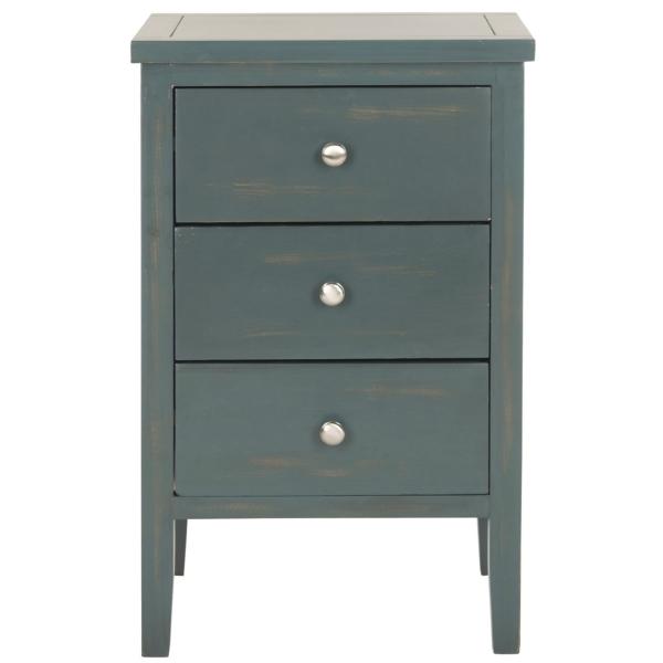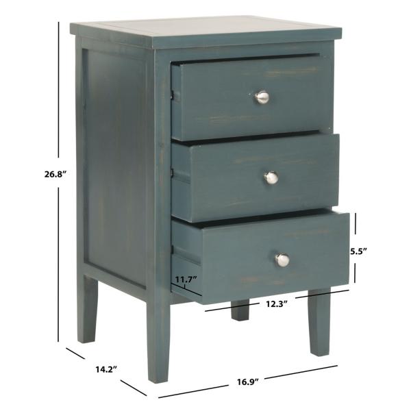 Get organized in style with the Teal Wood 3-Drawer Denise End Table. Featuring three roomy drawers, this table coordinates with any decor while storing items with French country flair. End table measures 17W x 14.2D x 26.8H in. Crafted of wood Ash gray finish Features three (3) drawers Silver metal drawer pulls Drawers measure 12.3W x 5.5D x 11.7H in. Weight: 23 lbs. Weight capacity: 45 lbs. No assembly required Not intended for commercial use Care: Wipe with a soft, dry cloth. This item is available at Kirklands.com only, not available in stores. Please note: this item cannot be shipped to APO/FPO addresses.