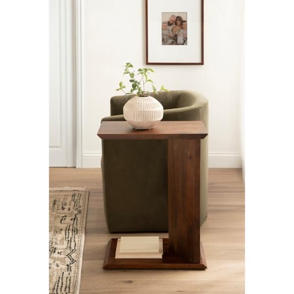 This Thaxter Walnut Brown Wood C-Table is a convenient mobile work station or snack surface. It's perfect for holding snacks and drinks or a laptop while you're on the couch! Table measures 20L x 10W x 27.5H in. Crafted of solid mango wood Walnut brown finish Features a C-shaped design Angled pedestal Weight: 15 lbs. Weight capacity: 20 lbs. Assembly required Not intended for commercial use Care: Wipe with a soft, dry cloth. This item is available at Kirklands.com only, not available in stores. Please note: this item cannot be shipped to APO/FPO addresses.