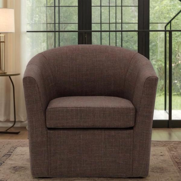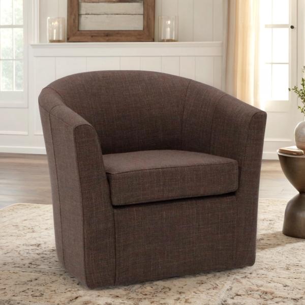 Comfort meets style with this Truffle Brown Upholstered Swivel Accent Chair! Featuring a supportive back, armrests, and a thick cushion, this chair is perfect for setting up a cozy nook or relaxing den. Accent chair measures 30.5W x 27D x 30H in. Crafted with a wood and metal frame Upholstered in brown polyester and filled with high-density foam Features a traditional club chair design Flared arms 360 degree swivel capability Weight: 34 lbs. Weight capacity: 300 lbs. No assembly required Made in the United States Not intended for commercial use Care: Spot clean. This item is available at Kirklands.com only, not available in stores. Please note: this item cannot be shipped to APO/FPO addresses.