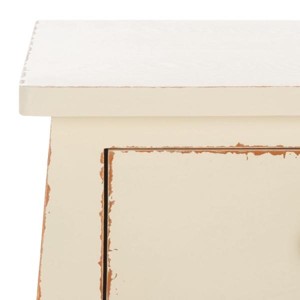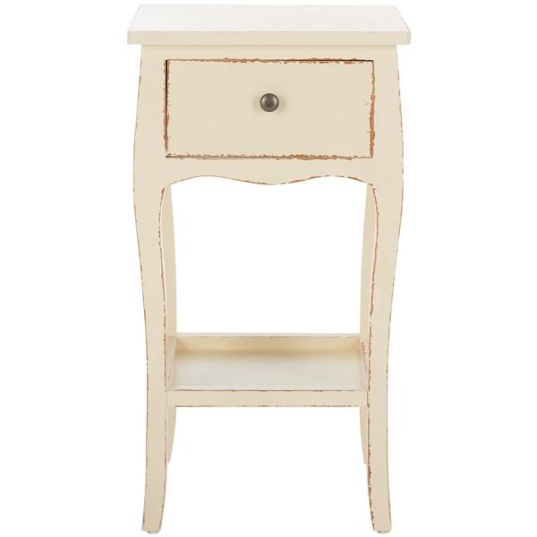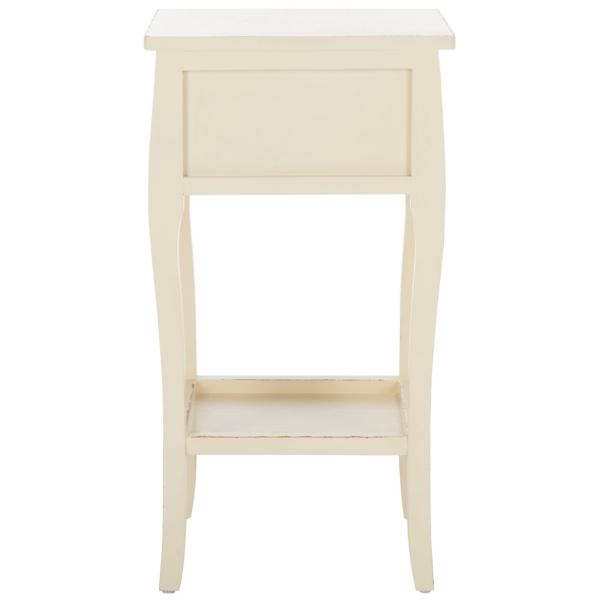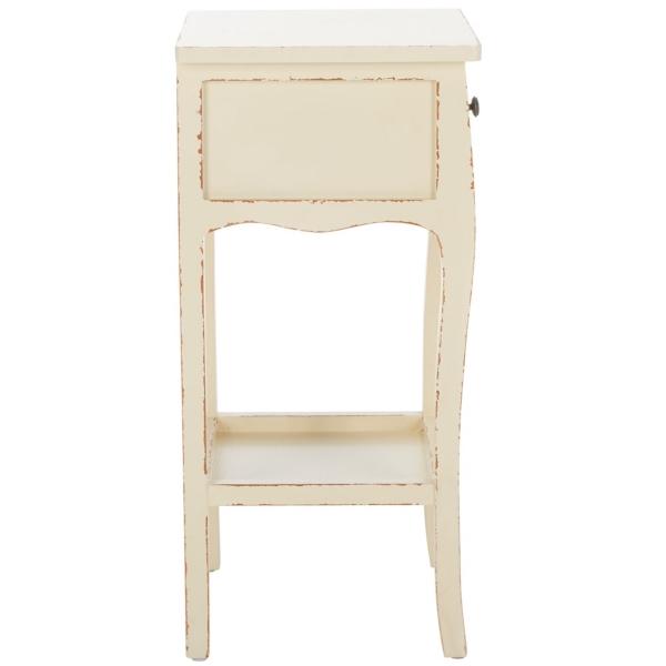 This Vintage Cream Wood Frieda End Table beautifully updates traditional French grace for today’s classic-contemporary interiors! Its single drawer and petite shelf make it ideal beside an armchair or in pairs framing a sofa. End table measures 16.1W x 14.2D x 30H in. Crafted of fir wood Vintage cream finish Features one (1) drawer and one (1) lower shelf Curved apron design Drawer measures 10.9W x 5.1D x 11.1H in. Shelf measures 11.7W x 10.7D x 12.5H in. Weight: 15.4 lbs. Weight capacity: 35 lbs. No assembly required Not intended for commercial use Care: Wipe with a soft, dry cloth. This item is available at Kirklands.com only, not available in stores. Please note: this item cannot be shipped to APO/FPO addresses.