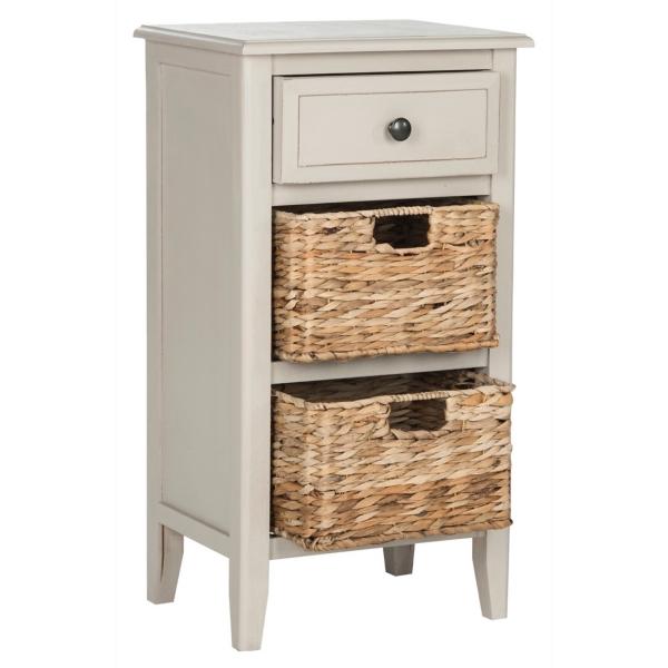 This Vintage Gray Wood Woven Baskets Everly Accent Table is perfect for small spaces! The stylish storage baskets make it easy to keep your home organized. Use as a nightstand or end table to upgrade your space! Accent table measures 15W x 11.8D x 26H in. Crafted of pine Vintage gray finish Features one (1) drawer and two (2) shelves Comes with two (2) woven storage baskets Weight: 23 lbs. Weight capacity: 45 lbs. No assembly required Not intended for commercial use Care: Dust with a soft, dry cloth. This item is available at Kirklands.com only, not available in stores. Please note: this item cannot be shipped to APO/FPO addresses.