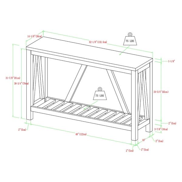 Make your house feel like a home with this lovely Walnut and Whitewash A-Frame Console Table. It will match your farmhouse decor perfectly! It’s the perfect place to display your candle holders, hurricanes, and favorite statues! Table measures 52L x 14W x 32H in. Crafted of warp-resistant wood composite and durable laminate Espresso top finish Whitewash base finish Features one (1) lower shelf for storage Open slatted shelf look A-frame back and side designs Square legs Full assembly required Not intended for commercial use Care: Dust with a soft, dry cloth. This item is available at Kirklands.com only, not available in stores. Please note: this item cannot be shipped to APO/FPO addresses.
