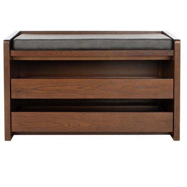 Bring style and warmth to any entryway with this contemporary Walnut Wood Irma Open Shelf Bench! Its rich walnut wood finish and gray faux leather upholstery complement any décor. Its pull-out shelves are perfect for shoe storage! Bench measures 33.8W x 17.5D x 20.6H in. Crafted of MDF, veneer, and metal Walnut finish Upholstered in gray faux leather and filled with high-density foam Features two (2) pull-out shelves Shelves measure 30.8W x 13D x 5H in. Weight: 62 lbs. Weight capacity: 275 lbs. Assembly required Not intended for commercial use Care: Spot clean. This item is available at Kirklands.com only, not available in stores. Please note: this item cannot be shipped to APO/FPO addresses.