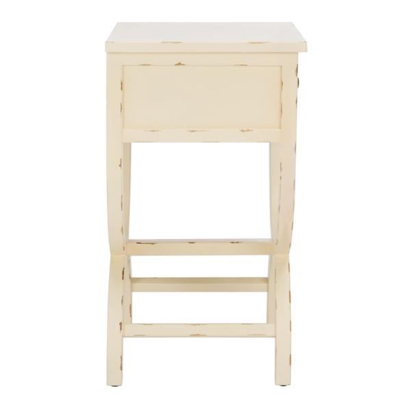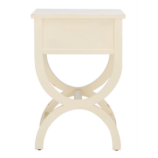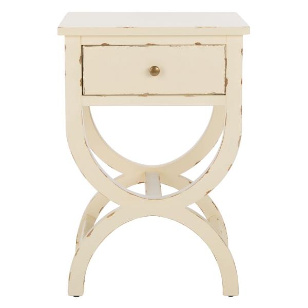 This Weathered Vanilla Contemporary Maxine Accent Table is the quintessential piece to give your decor a touch of modern charm. The perfect accent for any room, it provides discrete storage and revitalizes a classic silhouette! Overall dimensions Width: 18 in. Depth: 15 in. Height: 26.8 in. Crafted of poplar wood Distressed ivory finish Features one (1) drawer Modern curved base Gold metal drawer pull Weight: 15.4 lbs. Weight capacity: 25 lbs. No assembly required Color may vary slightly due to photography lighting or monitor display Not intended for commercial use Care: Dust with a soft, dry cloth. This item is available at Kirklands.com only, not available in stores. Please note: this item cannot be shipped to APO/FPO addresses.