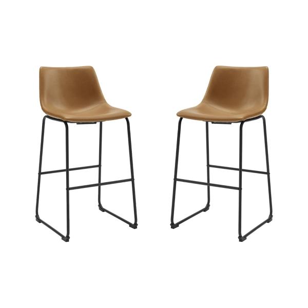 Bring the sophisticated look of leather seating into your home with our set of Whiskey Brown Faux Leather Bar Stools. The concave seat and counter height are the perfect addition for everyday use! Set includes two (2) stools Each chair measures 18L x 22W x 40H in.; seat height measures 30 in. Crafted with a sturdy metal frame Chair sits on powder coated steel legs Seat made of faux leather upholstery Concave whiskey brown seat and back Decorative horizontal stitching design Seat at counter height with foot rest Full assembly required Weight limit: 250 lbs. Not intended for commercial use Care: Dust with a soft, dry cloth. This item is available at Kirklands.com only, not available in stores. Please note: this item cannot be shipped to APO/FPO addresses.