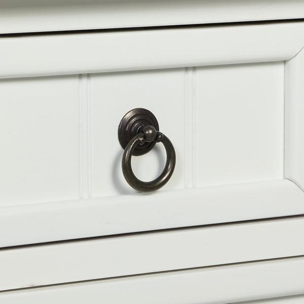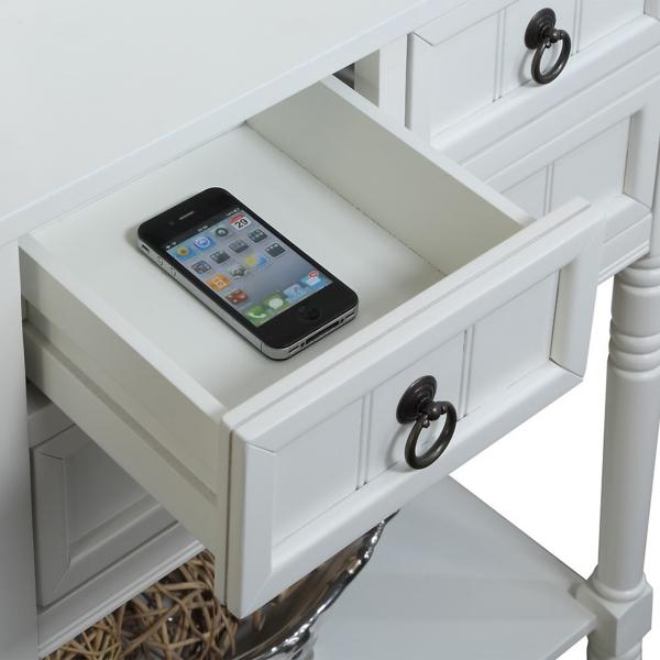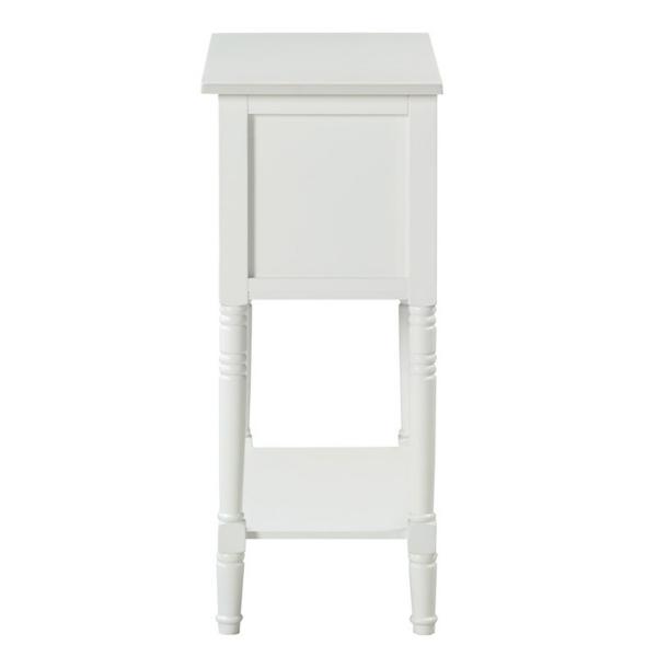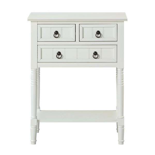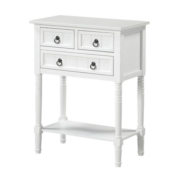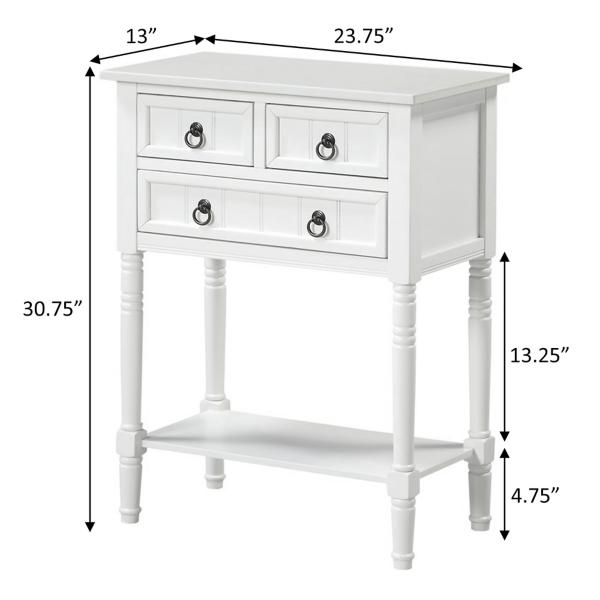 From your entryway to your bedroom, this stylish White 3-Drawer Turned Legs Accent Table has the perfect amount of storage space! You'll love the look of the traditional accents while it keeps your space organized. Accent table measures 23.75W x 13D x 30.75H in. Crafted of solid wood and MDF White finish Features three (3) drawers and one (1) lower shelf Accented with turned legs and shaker drawers Weight: 28 lbs. Weight capacity: 40 lbs. Easy assembly required Not intended for commercial use Care: Wipe with a soft, dry cloth. This item is available at Kirklands.com only, not available in stores. Please note: this item cannot be shipped to APO/FPO addresses.