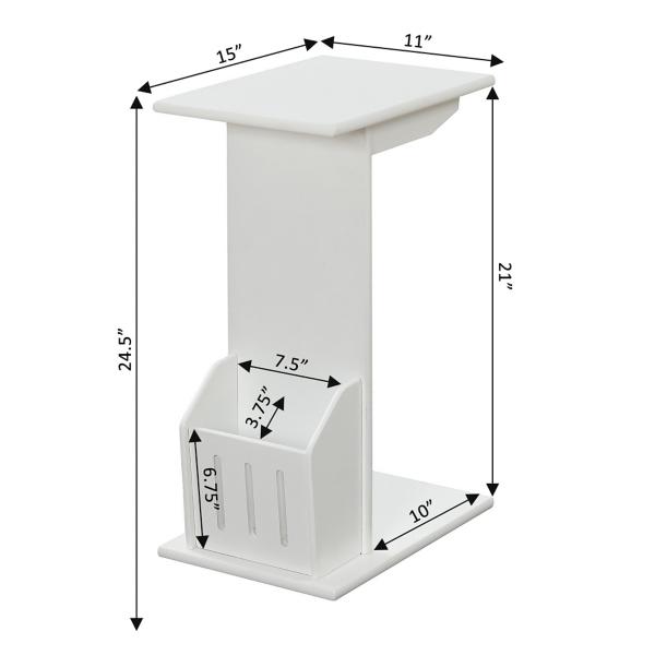 With its simple, modern look and compact build, this White Accent Table with Magazine Holder is ideal for any space. Its built-in storage compartment conveniently keeps magazines, books, and newspapers organized! Table measures 11L x 15W x 24.5H in. Crafted of wood composite White finish C-table design Features an attached magazine holder at base Magazine holder measures 7.5L x 3.75W x 6.75H in. Weight: 11 lbs. Weight capacity: 20 lbs. Assembly required Not intended for commercial use Care: Dust with a soft, dry cloth. This item is available at Kirklands.com only, not available in stores. Please note: this item cannot be shipped to APO/FPO addresses.