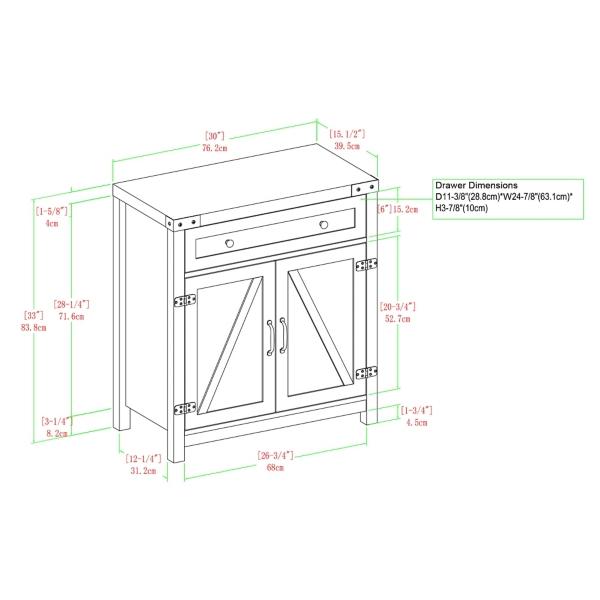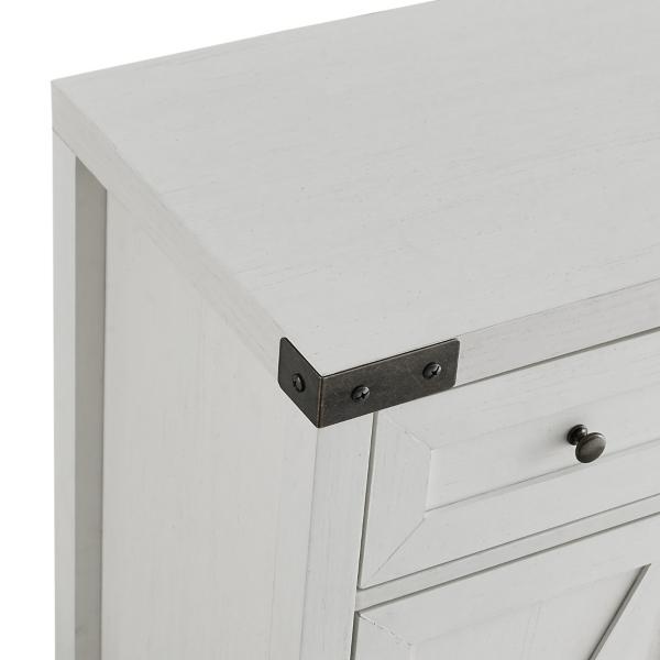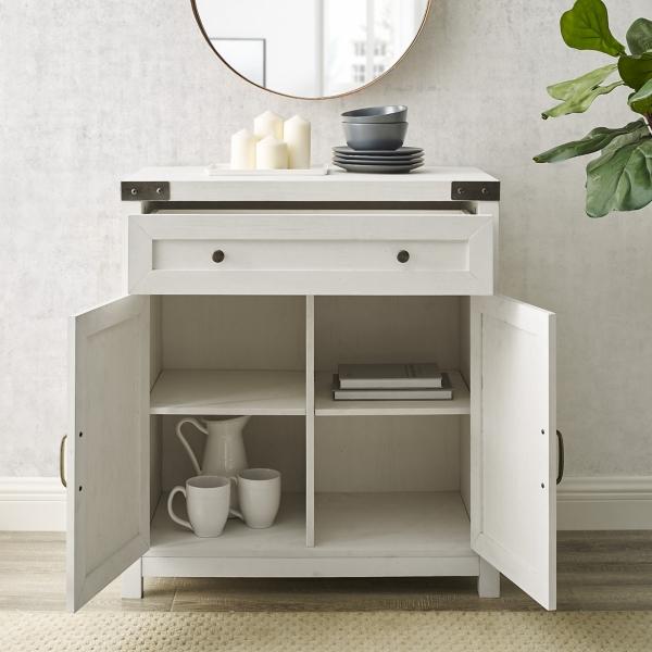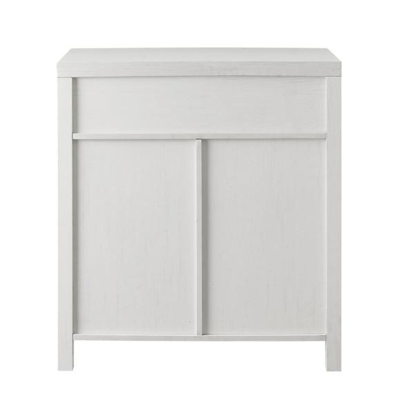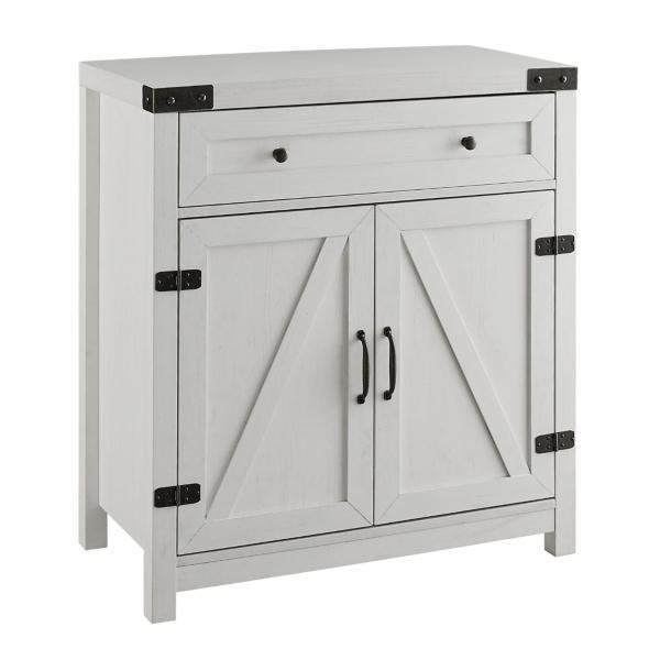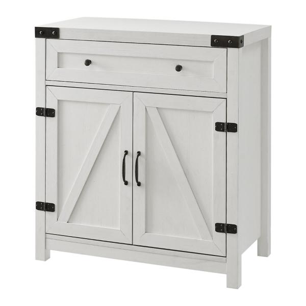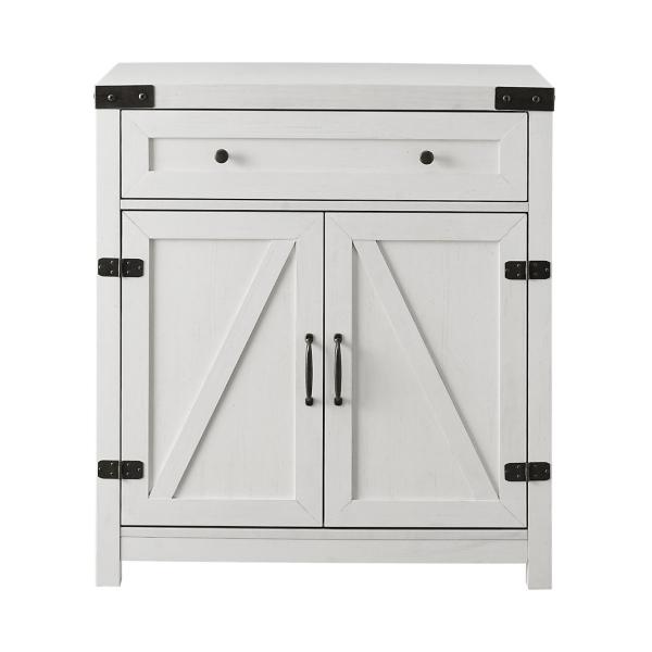 Organize your living or dining space with our charming White Barnwood Style Wooden Cabinet! Its compact design still features plenty of storage space for your items. Cabinet measures 30L x 15.5W x 33H in. Crafted of wood composite White laminate finish Features two (2) cabinets and one (1) drawer Farmhouse design Features black metal hardware accents and hardware Assembly required Not intended for commercial use Care: Spot clean only. This item is available at Kirklands.com only, not available in stores. Please note: this item cannot be shipped to APO/FPO addresses. WARNING: This product can expose you to chemicals including dust and phthalates which is known to the state of California to cause cancer and birth defects or other reproductive harm. For more information go to www.P65Warnings.ca.gov.