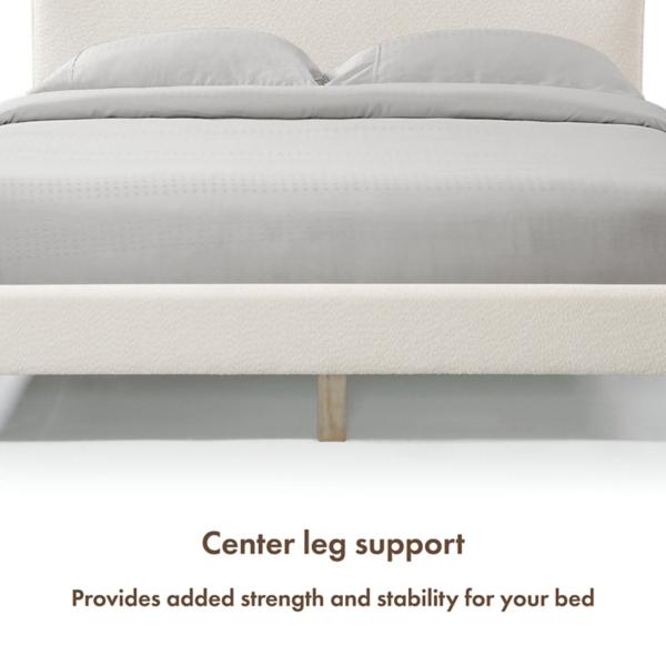Give your bedroom a cozy makeover with this White Boucle Upholstered Sara Queen Bed! This bed features boucle upholstery with a tufted headboard to add texture and enhance your comfort. Bed measures 83.7L x 62.2W x 43.1H in. Crafted with a wood frame Black tapered legs Upholstered in white polyester with foam fill Boucle fabric design Features an adjustable headboard Accommodates a standard queen mattress; mattress not included Channel tufted headboard Includes a wood slat kit; no box spring needed Additional center legs for stability Weight: 73.85 lbs. Weight capacity: 1000 lbs. Assembly required Not intended for commercial use Care: Spot clean. This item is available at Kirklands.com only, not available in stores. Please note: this item cannot be shipped to APO/FPO addresses.