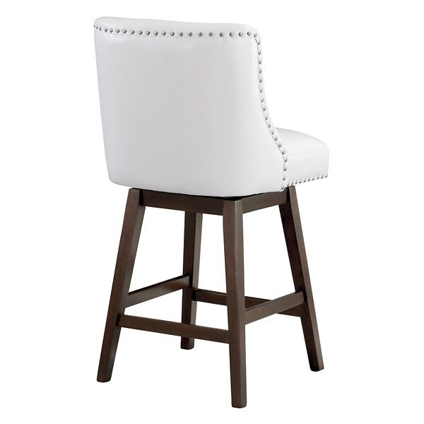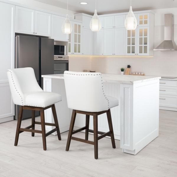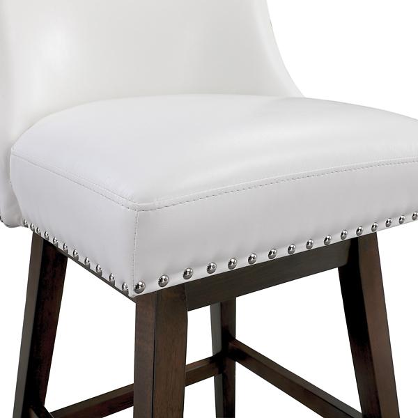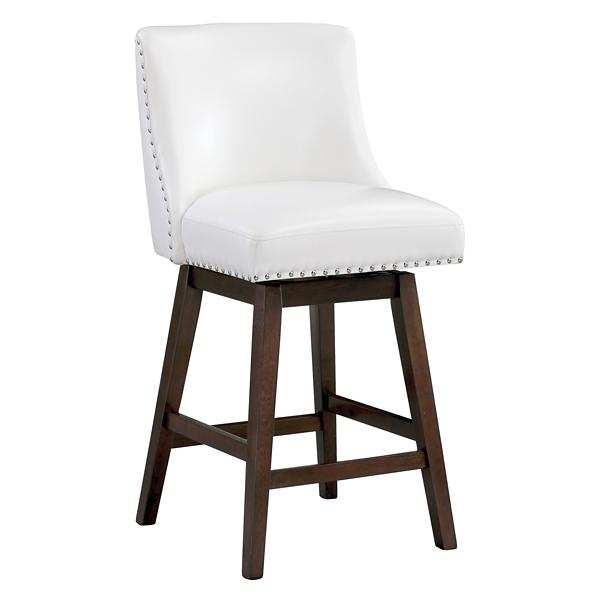 Refresh your kitchen with these White Bowden Swivel Counter Stools! With white faux leather upholstery and padded swivel seats, these stools will make your counter your new favorite place to enjoy a cup of coffee or entertain guests! Set includes two (2) counter stools Each stool measures 20W x 22.25D x 38.75H in.; seat height: 27 in. Crafted of wood Upholstered in white faux leather and filled with high-density foam Dark walnut wood finish Features swivel design Accented with nailhead trim Curved padded back with thick padded seat Weight capacity: 250 lbs Assembly required Not intended for commercial use Care: Wipe with a soft, dry cloth. This item is available at Kirklands.com only, not available in stores. Please note: this item cannot be shipped to APO/FPO addresses.