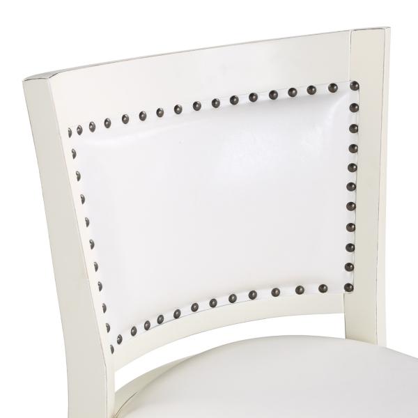Bring a fresh, sophisticated touch to your kitchen or bar area with this White Faux Leather Bristol Swivel Counter Stool! Its seat and backrest are accented with classic nailhead trim, adding a refined detail that enhances its modern silhouette. Counter stool measures 22.5W x 22.5D x 39H in.; seat height: 25.75 in. Crafted with a wood frame Upholstered in white faux leather and filled with high-density foam White wood finish Features a 360 degree swivel design Accented with brass nailhead trim Protective metal kick plate Weight capacity: 300 lbs. Assembly required Not intended for commercial use Care: Wipe with a soft, dry cloth. This item is available at Kirklands.com only, not available in stores. Please note: this item cannot be shipped to APO/FPO addresses.