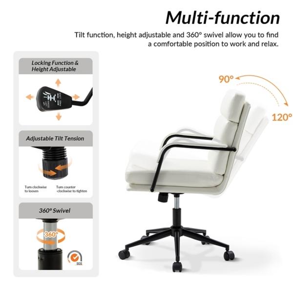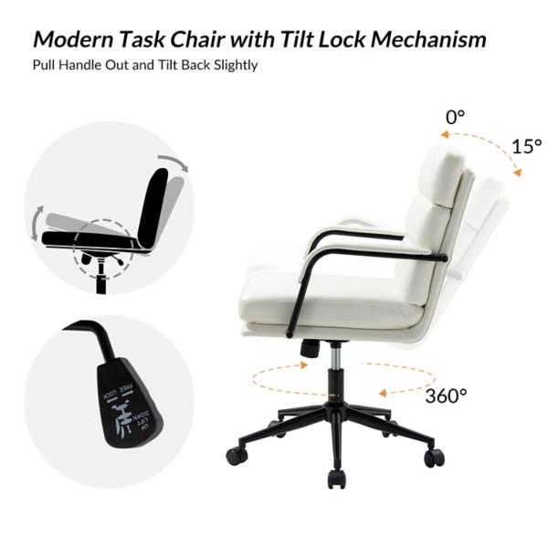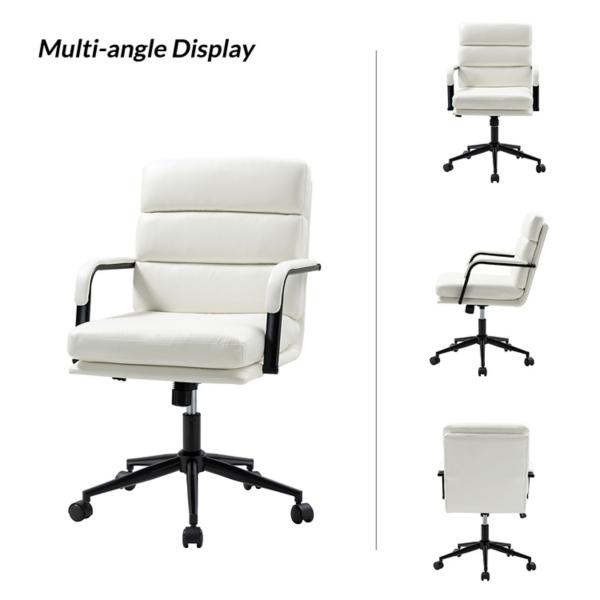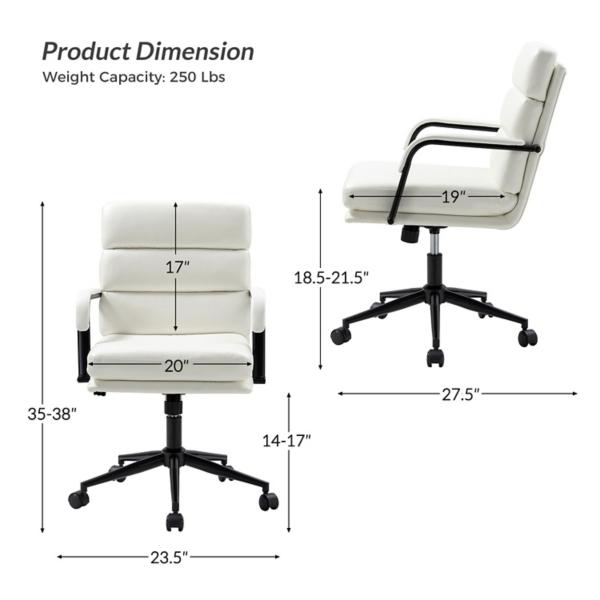 You’ll start looking forward to work days with this White Faux Leather Indigo Office Chair! This luxurious chair features plush seating, chic faux leather, swivel capability, and a tilt mechanism to make working comfortable and stylish. Office chair measures 23.5W x 27.5D x 35-38H in. Crafted with a wood frame and metal base Upholstered in white faux leather and filled with high-density foam Black metal finish Features adjustable tilt function with tilt lock mechanism 360 degree swivel Adjustable height Seat measures 20W x 19D x 18.5-21.5H in. Weight: 28 lbs. Weight capacity: 250 lbs. Assembly required Not intended for commercial use Care: Wipe with a soft, dry cloth. This item is available at Kirklands.com only, not available in stores. Please note: this item cannot be shipped to APO/FPO addresses.