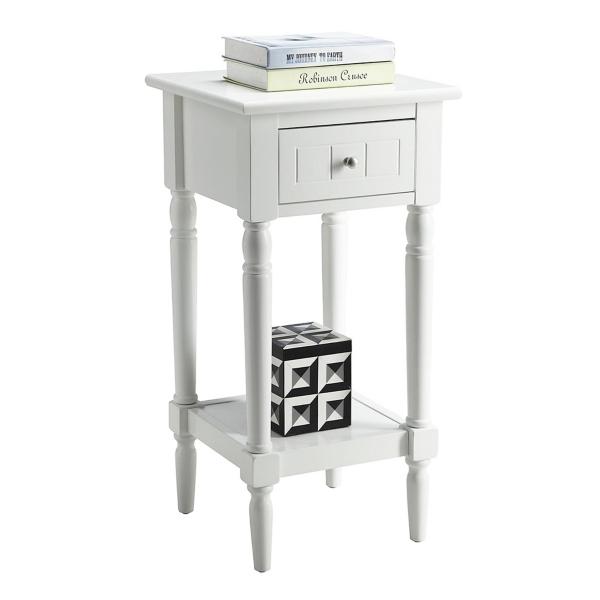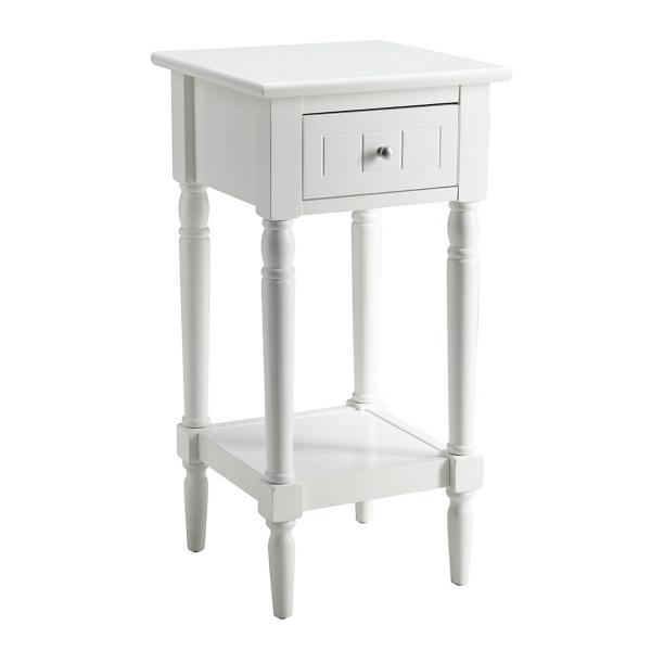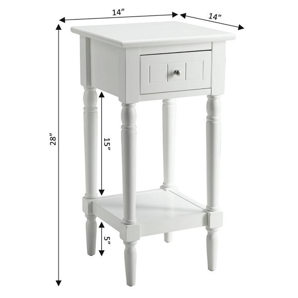 Featuring storage space and a beautifully smooth finish, this White French Country Square Accent Table will make a stylish and functional addition to any space! Its classic design is an ideal base for decor and easily complements any furniture. Table measures 14L x 14W x 28H in. Crafted of wood composite and solid wood White painted finish Features one (1) drawer and one (1) lower shelf Turned legs Engraved design on drawer face Weight capacity: 17 lbs. Shelf weight capacity: 20 lbs. Assembly required Not intended for commercial use Care: Dust with a soft, dry cloth. This item is available at Kirklands.com only, not available in stores. Please note: this item cannot be shipped to APO/FPO addresses.