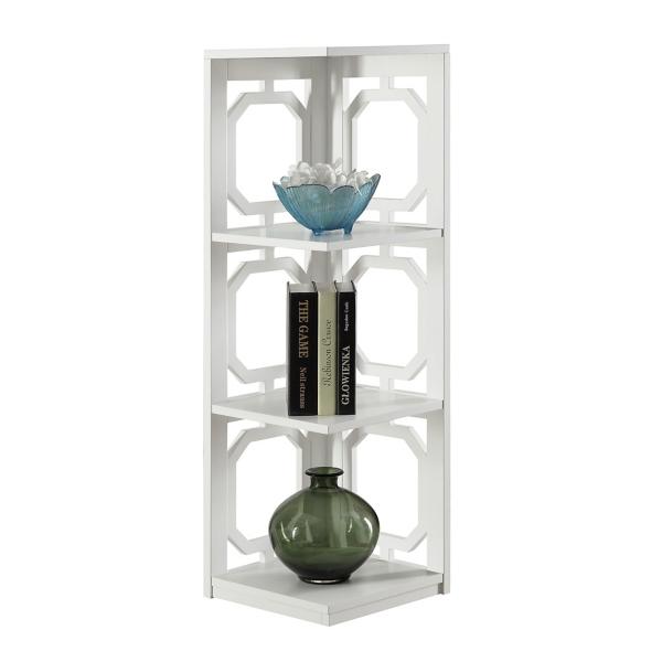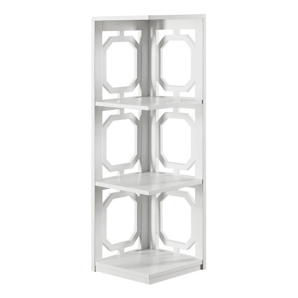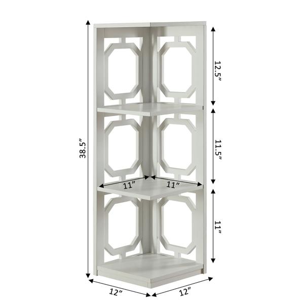 Turn any unused corner into a stylish focal point with this White Geometric 3-Tier Corner Shelf! Designed to blend elegance with practicality, this three-tier shelving unit is perfect for showcasing your favorite décor while saving space. Bookcase measures 12W x 12D x 38.5H in. Crafted of MDF White finish Features three (3) tiers of shelving Geometric cut-outs Corner design Weight: 16 lbs. Weight capacity: 4.4 lbs. per shelf Assembly required Not intended for commercial use Care: Wipe with a soft, dry cloth. This item is available at Kirklands.com only, not available in stores. Please note: this item cannot be shipped to APO/FPO addresses.