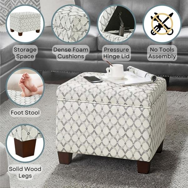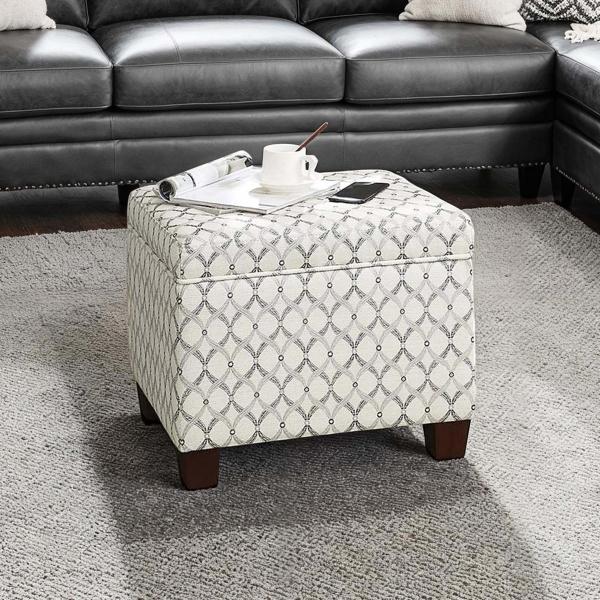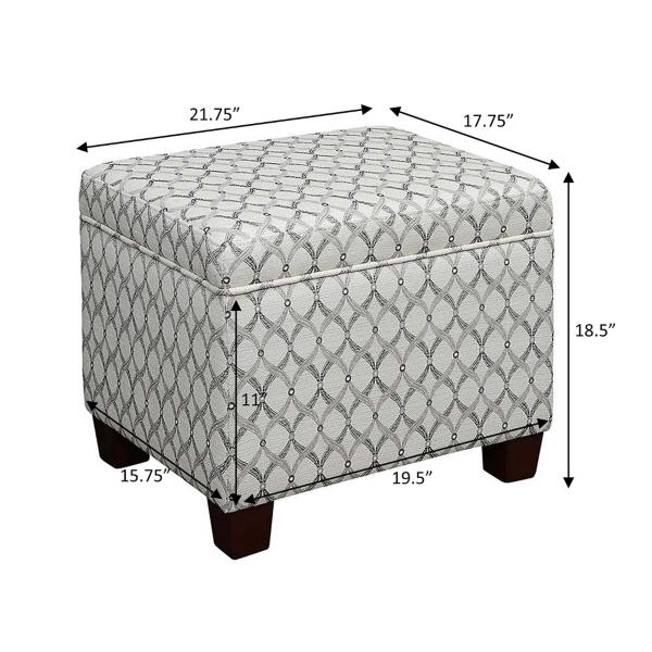 Bring an elegant and functional touch to your living room or bedroom with this White & Gray Madison Storage Ottoman! With a sophisticated upholstery design and interior storage space, you’ll love how easy it is to incorporate this ottoman into your space! Ottoman measures 21.5L x 17.75W x 18.5H in. Crafted with a wood frame Upholstered in fabric with high-density foam Espresso wood finish Gray and white ribbon upholstery pattern Tapered wood block feet Features interior storage space Pressure hinge to allow lid to stay open on its own Easy assembly: Attach feet. Not intended for commercial use Care: Spot clean. This item is available at Kirklands.com only, not available in stores. Please note: this item cannot be shipped to APO/FPO addresses.