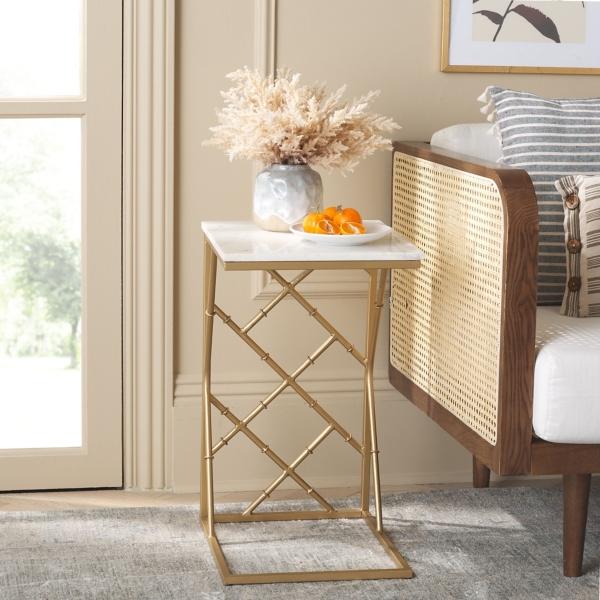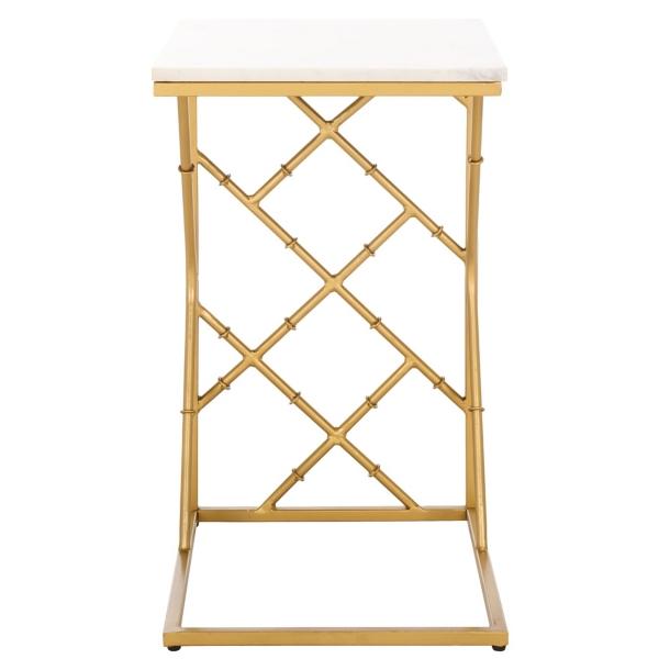 A lavish expression of eclectic elegance, this White Marble & Gold Dakota C-Table features a bamboo-inspired open diamond lattice in glimmering gold metal. A sleek white marble top completes the exquisite look! Table measures 14.3L x 16.3W x 25H in. Crafted of marble and metal White marble finish Gold metal finish Features a C-table design Bamboo-inspired open base Weight: 24.35 Weight capacity: 15 lbs. No assembly required Not intended for commercial use Care: Wipe with a soft, dry cloth. This item is available at Kirklands.com only, not available in stores. Please note: this item cannot be shipped to APO/FPO addresses.
