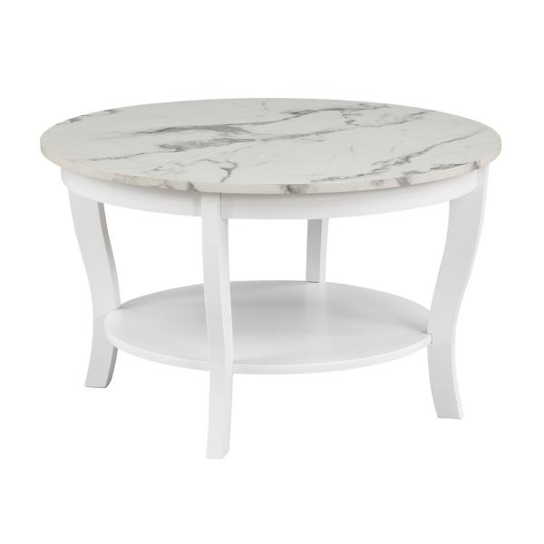 You'll love the classic look of this White Marble Round Coffee Table! With a bright white finish and marble tabletop design, this coffee table is perfect for adding a sophisticated look to your space. Coffee table measures 18H x 30 in. in diameter Crafted of solid rubberwood, manufactured wood, and detailed veneer White wood finish Round shape Features a marble-inspired tabletop Curved leg design Two (2) tiers of shelving Weight: 25 lbs. Weight capacity: 80 lbs. Assembly required Not intended for commercial use Care: Wipe with a soft, dry cloth. This item is available at Kirklands.com only, not available in stores. Please note: this item cannot be shipped to APO/FPO addresses.