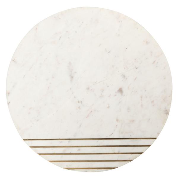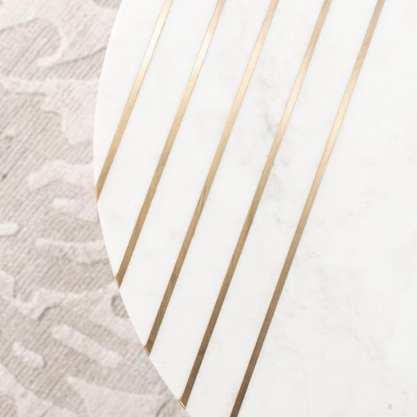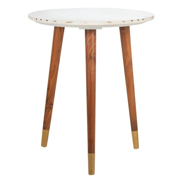 A modern masterpiece, this White Marble Round Valerie Accent Table updates any living room or bedroom! Designed to highlight its contemporary blend of materials, this table's sparkling brass inlay showcases its white marble top and natural wood legs. End table measures 23H x 20.5 in. in diameter Crafted of wood Brown finish Features a white marble tabletop Accented with brass inlay and leg caps Round shape Weight: 21 lbs. Weight capacity: 30 lbs. No assembly required Not intended for commercial use Care: Wipe with a soft, dry cloth. This item is available at Kirklands.com only, not available in stores. Please note: this item cannot be shipped to APO/FPO addresses.
