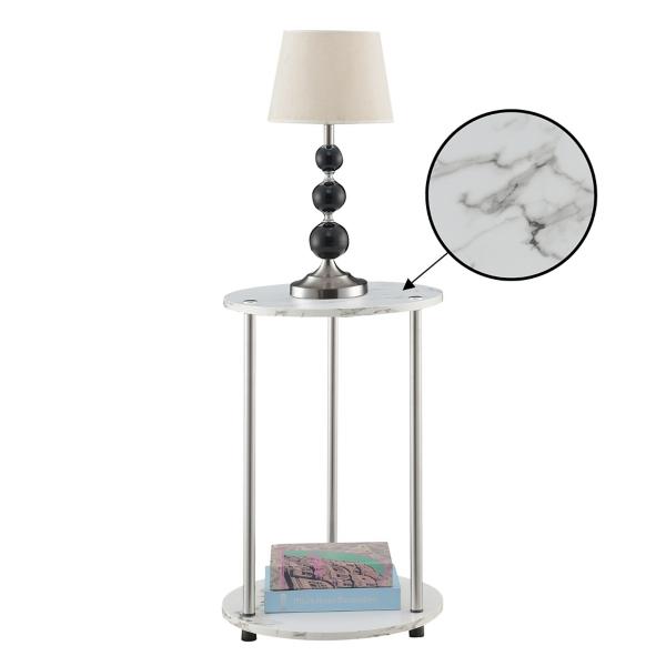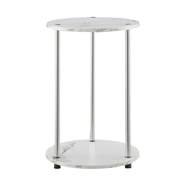 This White Marble Two Tiered Metal Accent Table is versatile to fit your needs! The white marble finish adds a chic touch to any room, whether you use it for bathroom storage or to display plants or decorative pieces! Accent table measures 22H x 15.75 in. in diameter; weighs 7 lbs. Crafted of particle board with a melamine finish and stainless steel White marble finish Features two (2) tiers Includes plastic caps with rubber soles Easy-to-maintain design Shelf capacity: 20 lbs. Minimal assembly required Not intended for commercial use Care: Dust with a soft, dry cloth. This item is available at Kirklands.com only, not available in stores. Please note: this item cannot be shipped to APO/FPO addresses.