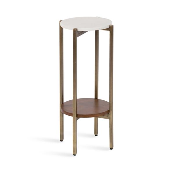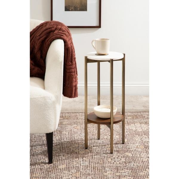 Our White Marble Walnut Accent Table is a beautiful combination of fashion and function to suit your needs. This side table is made by skilled artisans, making each piece absolutely one-of-a-kind! Table measures 24.25 x 10.75 H in. in diameter Crafted of mango wood, metal, and marble Walnut wood finish Antique brass metal finish White marble finish Features one (1) fixed lower shelf Weight capacity: 10 lbs. Some assembly required Care: Dust with a dry cloth. This item is available at Kirklands.com only, not available in stores. Please note: this item cannot be shipped to APO/FPO addresses. WARNING: Cancer and Reproductive Harm - For more information go to www.P65Warnings.ca.gov.