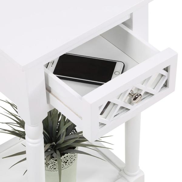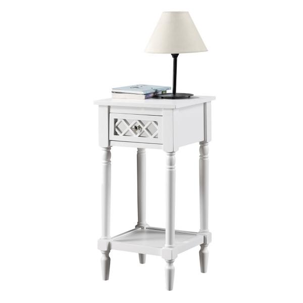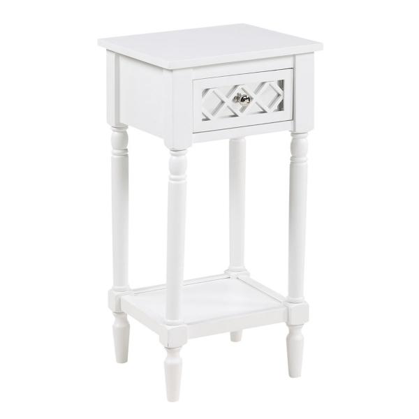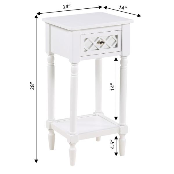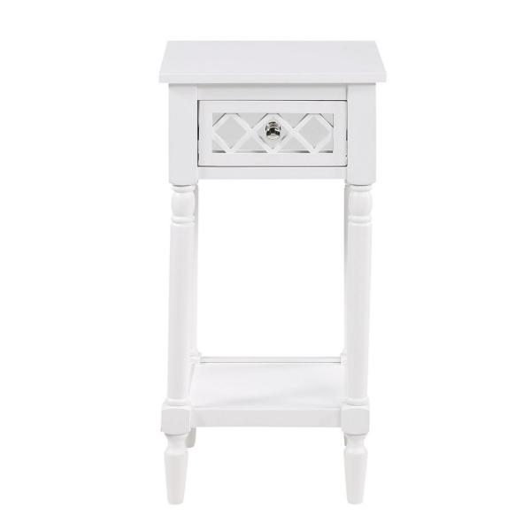 Featuring mirror embellishments and classic details, this White Mirrored Drawer Square Accent Table will instantly refresh your space! Its smooth, neutral finish will look wonderful placed beside your sofa, chair, or bed. Table measures 14L x 14W x 28H in. Crafted of wood composite and solid wood White painted finish Features one (1) drawer and one (1) lower shelf Carved, turned legs Drawer face features a crisscross pattern with mirror background Weight capacity: 18 lbs. Shelf weight capacity: 20 lbs. Assembly required Not intended for commercial use Care: Dust with a soft, dry cloth. This item is available at Kirklands.com only, not available in stores. Please note: this item cannot be shipped to APO/FPO addresses.