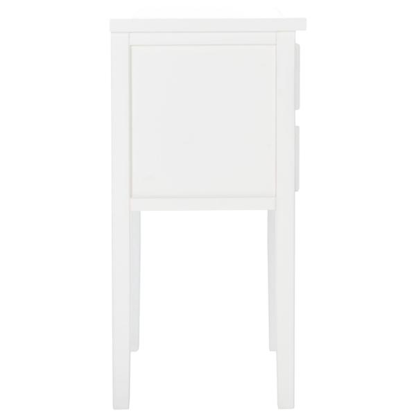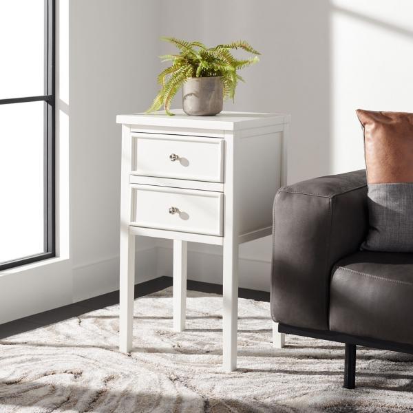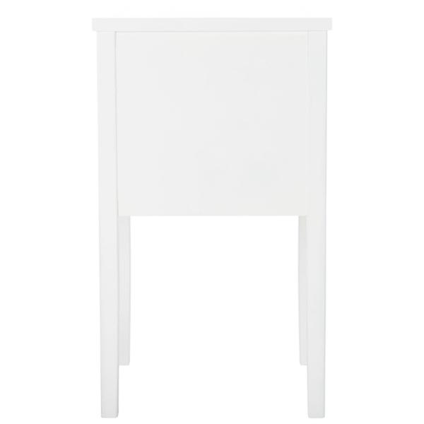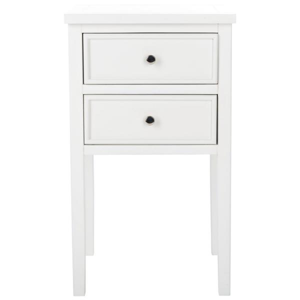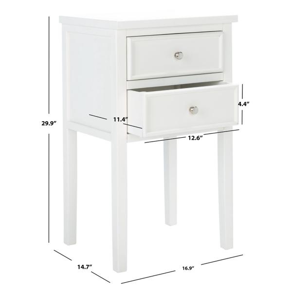 A French farmhouse take on a traditional end table, this White Poplar Mirsade Traditional Accent Table makes a chic addition to any interior. Its light, crisp finish and silver drawer pulls complete the look. Overall dimensions Width: 16.9 in. Depth: 14.7 in. Height: 29.9 in. Crafted of poplar wood and metal White finish Features two (2) drawers Silver drawer pulls Weight: 18.7 lbs. Weight capacity: 35 lbs. No assembly required Not intended for commercial use Care: Dust with a soft, dry cloth. This item is available at Kirklands.com only, not available in stores. Please note: this item cannot be shipped to APO/FPO addresses.